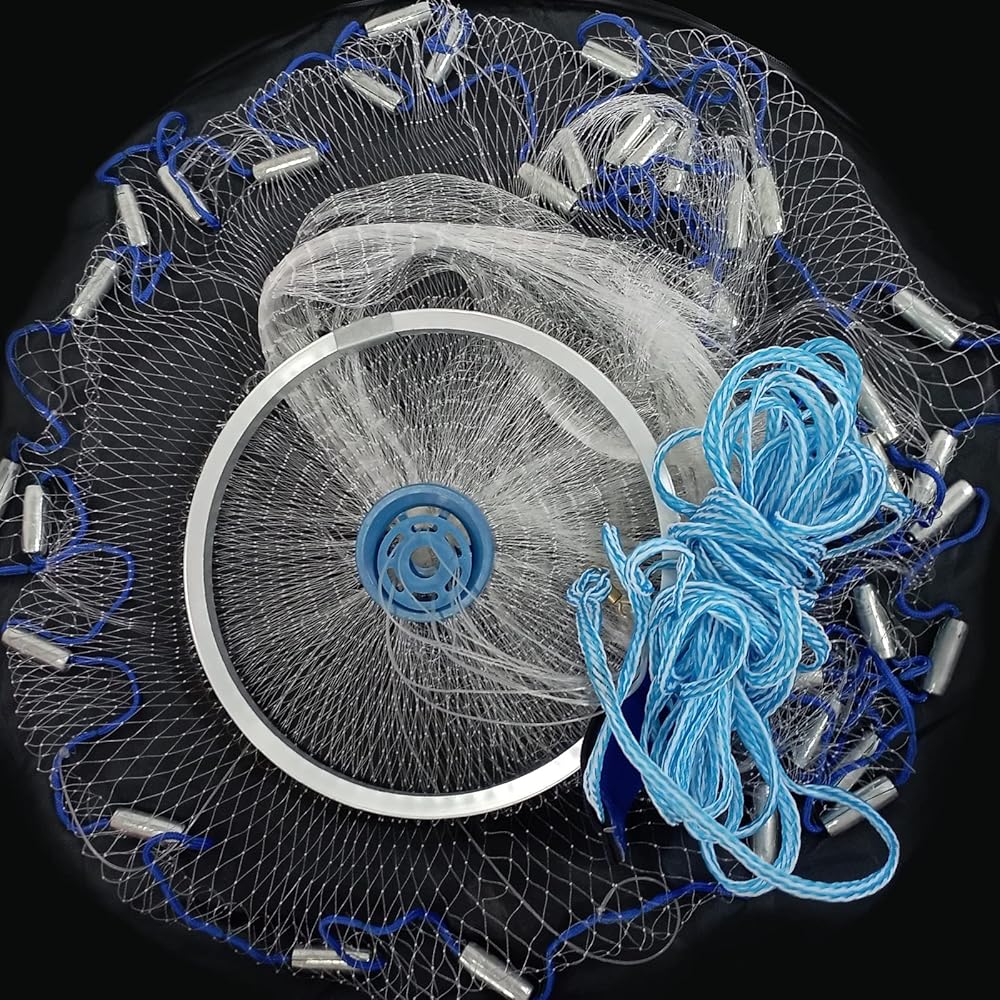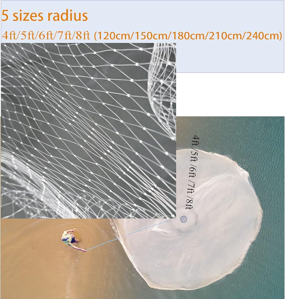 ✅【5 Sizes Radius】 Available in a variety of sizes: 4ft/5ft/6ft/7ft/8ft(120cm/150cm/180cm/210cm/240cm) radius. 4ft net is suitable for beginners and those with Little strength, 5ft net is suitable for those with average strength, 6ft net is suitable for people with normal strength and greater strength, and 7ft/8ft net is suitable for professionals and those with greater strength. Fishing net weight: 4feet: 2.73pounds, 5feet: 3.53pounds, 6feet: 3.97pounds, 7feet: 4.52pounds, 8feet: 5.07pounds.