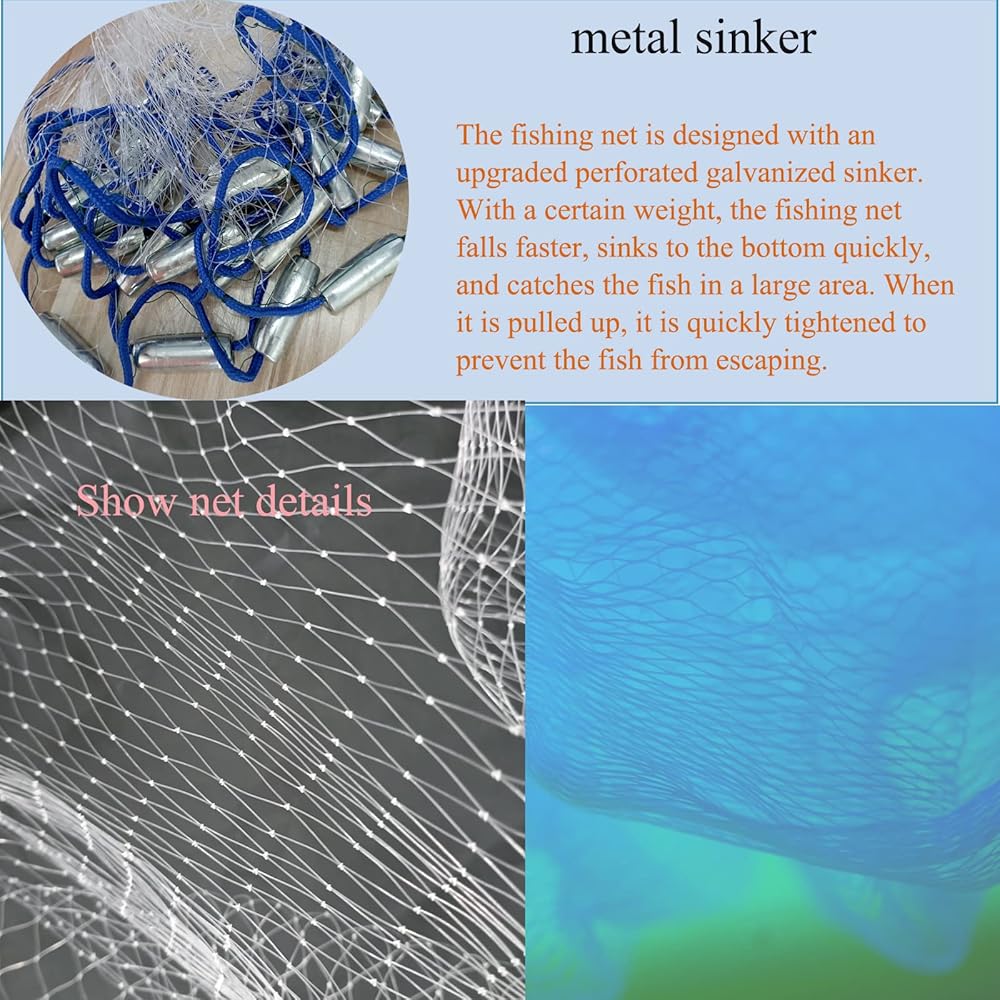 ✅【Metal Sinker】 Our throw nets for fishing are designed with an upgraded perforated galvanized sinker. With a certain weight, the fishing net falls faster, sinks to the bottom quickly, catches the fish in a large area, and tightens quickly when pulled up to prevent the fish from escaping.