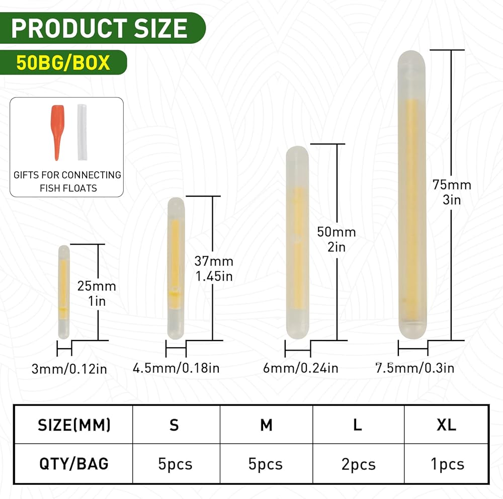 2.High Visibility In The Dark:Visibility:15M,30M,50M,100M. Glow extremely bright. The glow sticks are perfect for night fishing or early morning fishing . Perfect glow sticks for fishing lovers . Help to catch more fishes .