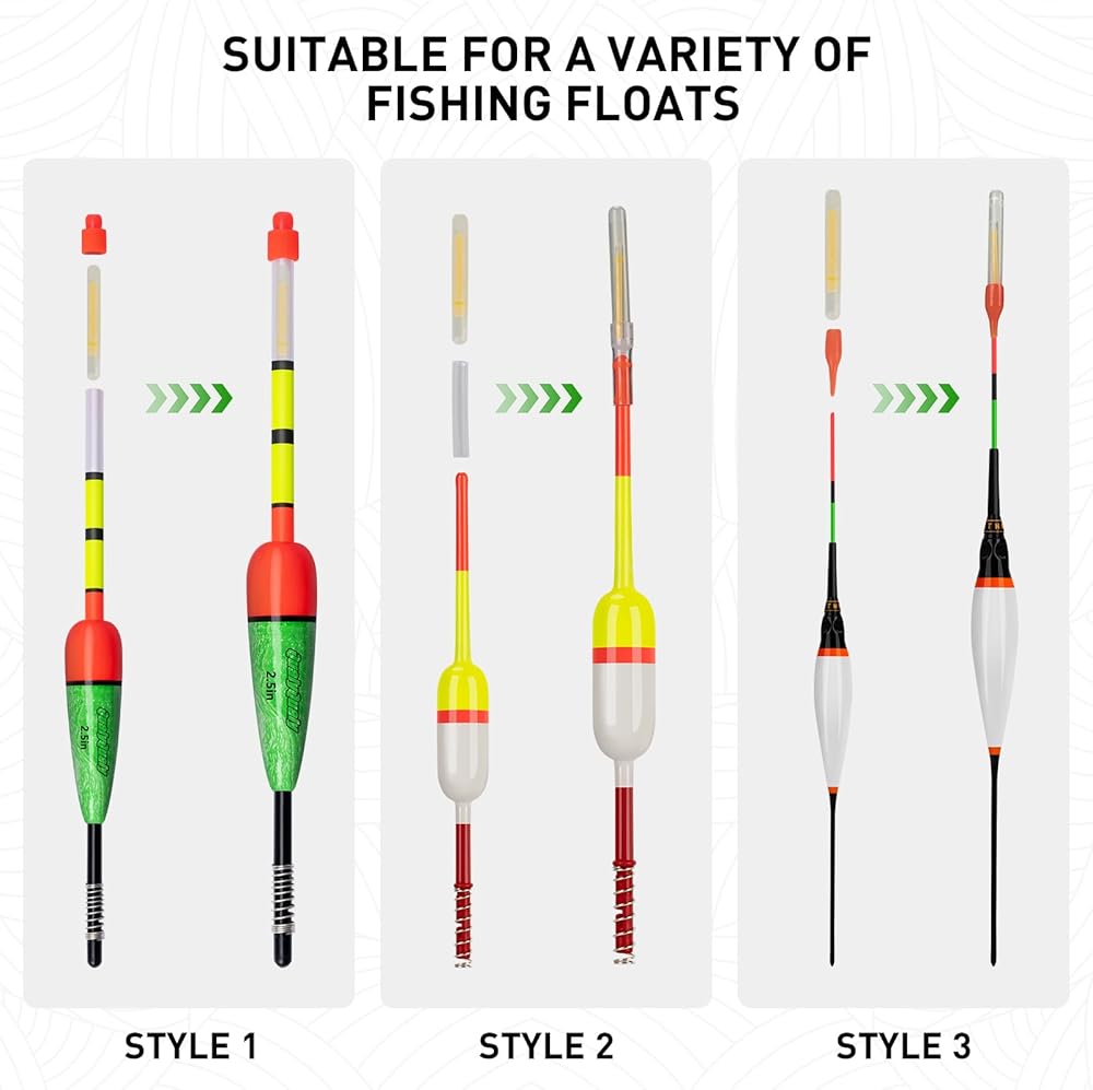 3.Multi-perpose Fishing Glow Sticks:Small sized glow sticks can be used on thin tail float, nd the big sized glow sticks can be used on thick tail bobbers,the glow sticks also can be used on fishing rod bell alarm, a great add for your fishing tackle,making night fishing much easier !