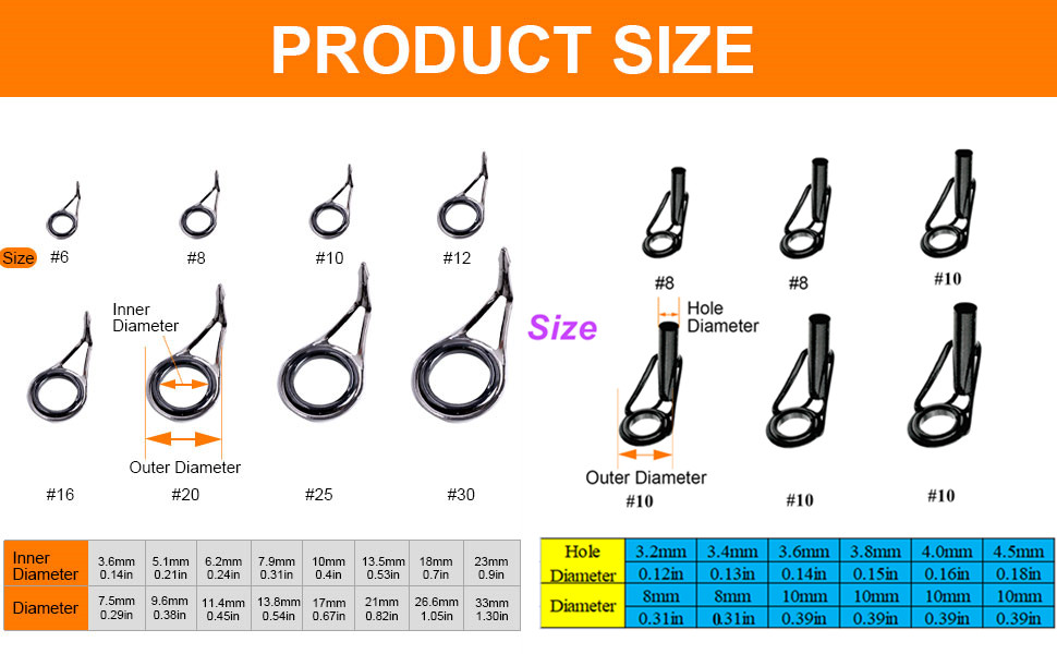 [Various Sizes Spinning Rod Guides] 75pcs in total. With a wide range of rods to repair, the best kit for anglers to repair their rod. Guide ring diameter: 6#*10pcs(3.6 mm/0.14in), 8#*10pcs(4.75 mm/0.2in), 10#*10pcs(6.16 mm/0.24in), 12#*10pcs(7.88 mm/0.31in), 16#*10pcs(10.14 mm/0.4in), 20# *10pcs(13.3 mm/0.52in), 25#*10pcs(17.8 mm/0.7in), 30#*5pcs (23 mm/0.9in).