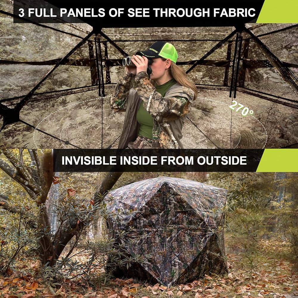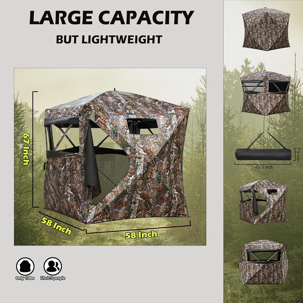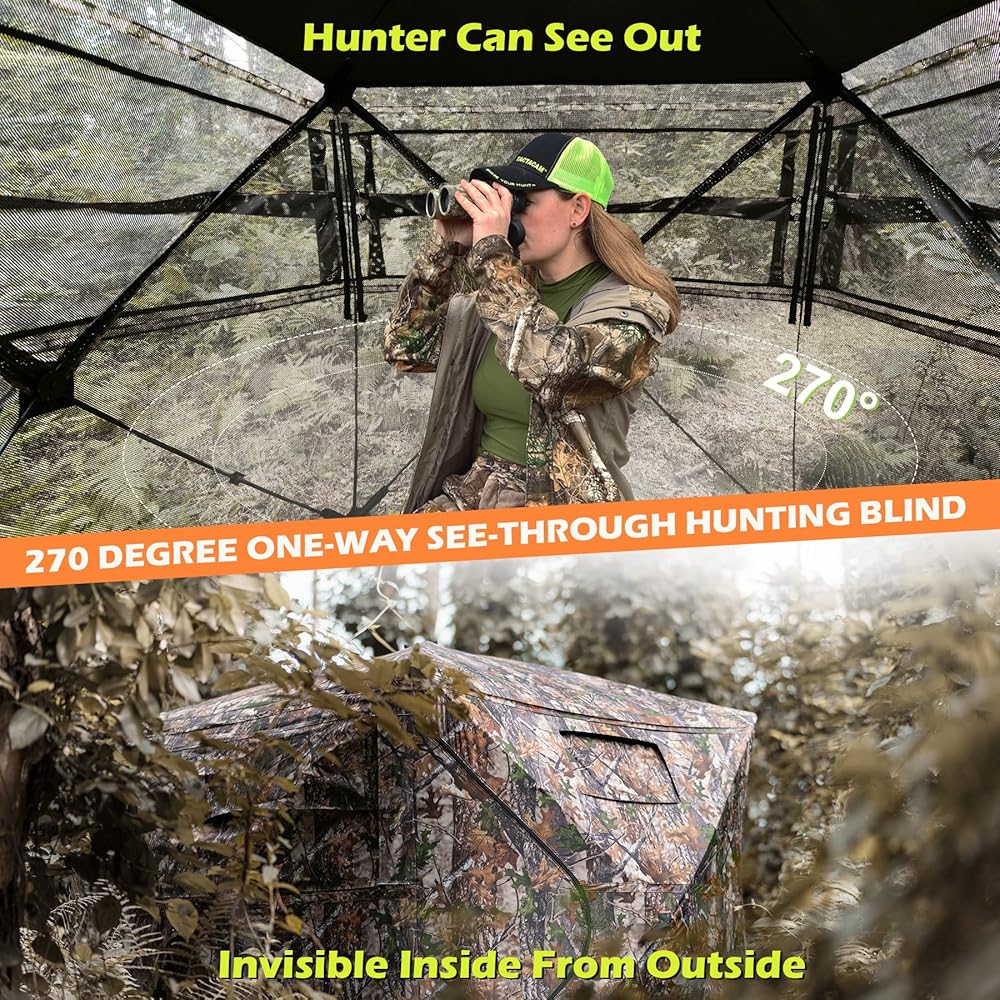 • 🍂 MAKE YOUR HUNTING BETTER - Big windows are on three sides that even a dark night or rainy days can giving you a 270 degree view. Silent-slide windows can adjustable any width or gap, and make it super quiet. An ultra-dark interior that keeping you undetected. Lifelike camouflage patterns design can integrate into the surrounding habitat naturally.
