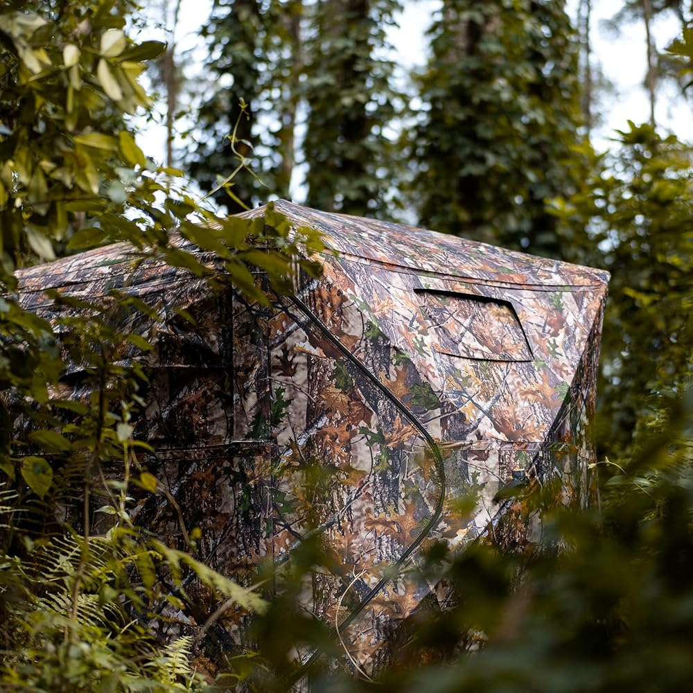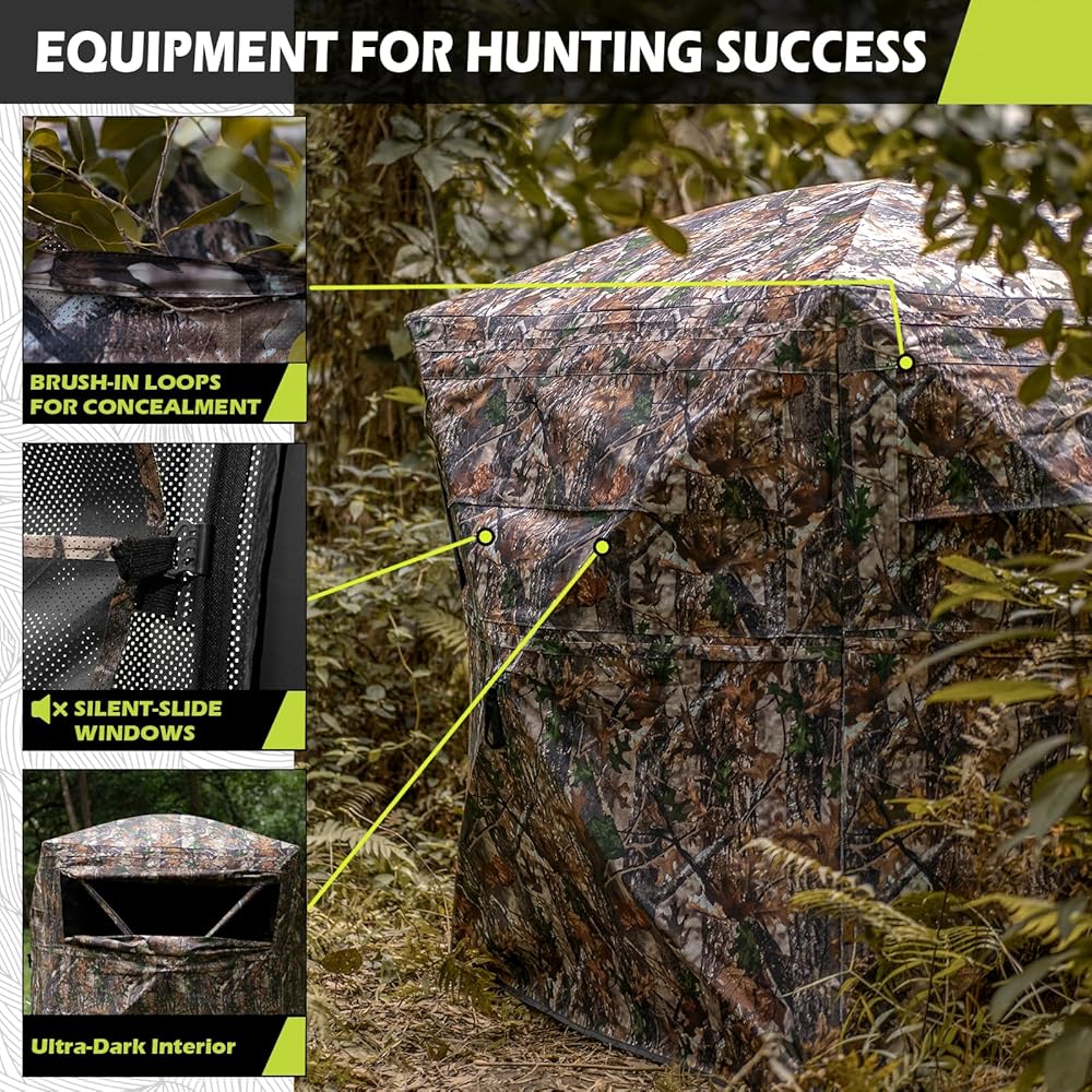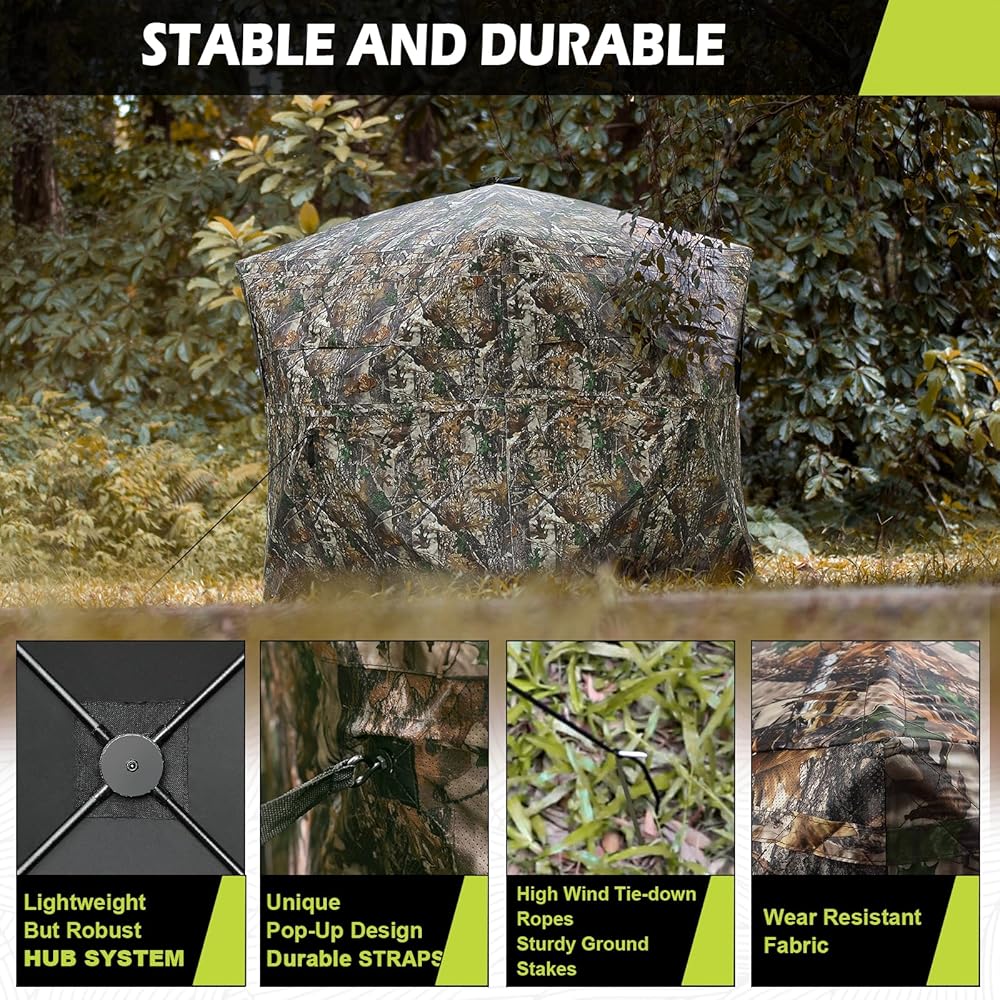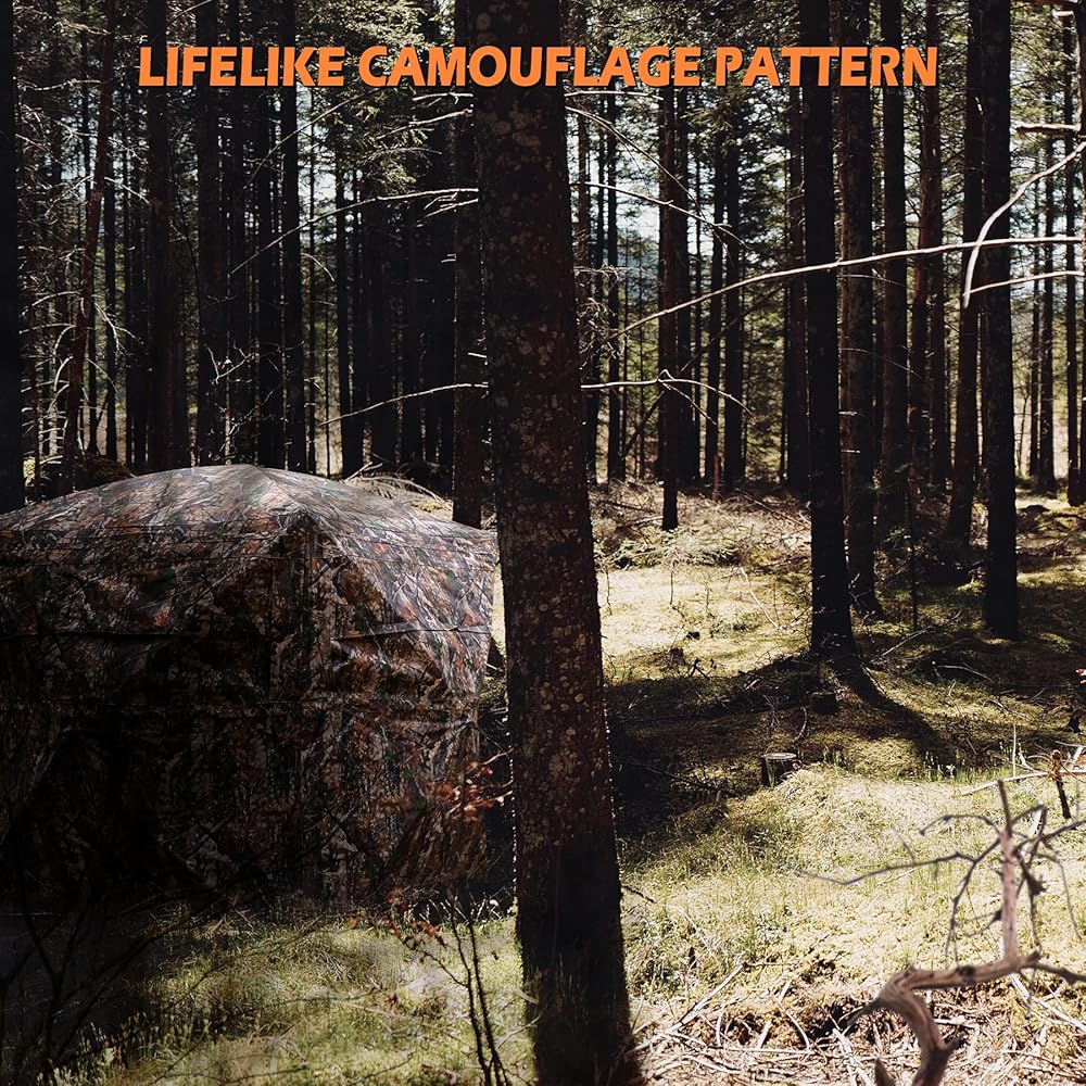 • 🍂 MAKE YOUR HUNTING BETTER - Big windows are on three sides that even a dark night or rainy days can giving you a 270 degree view. Silent-slide windows can adjustable any width or gap, and make it super quiet. An ultra-dark interior that keeping you undetected. Lifelike camouflage patterns design can integrate into the surrounding habitat naturally.