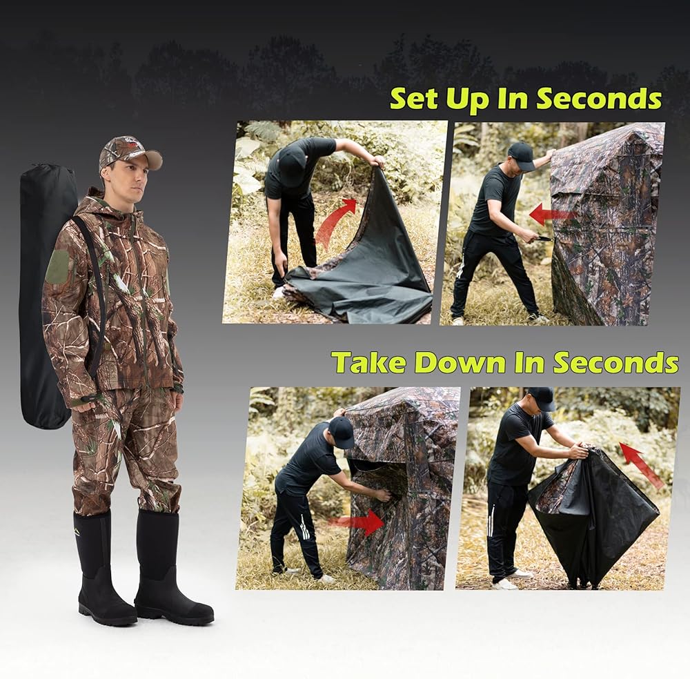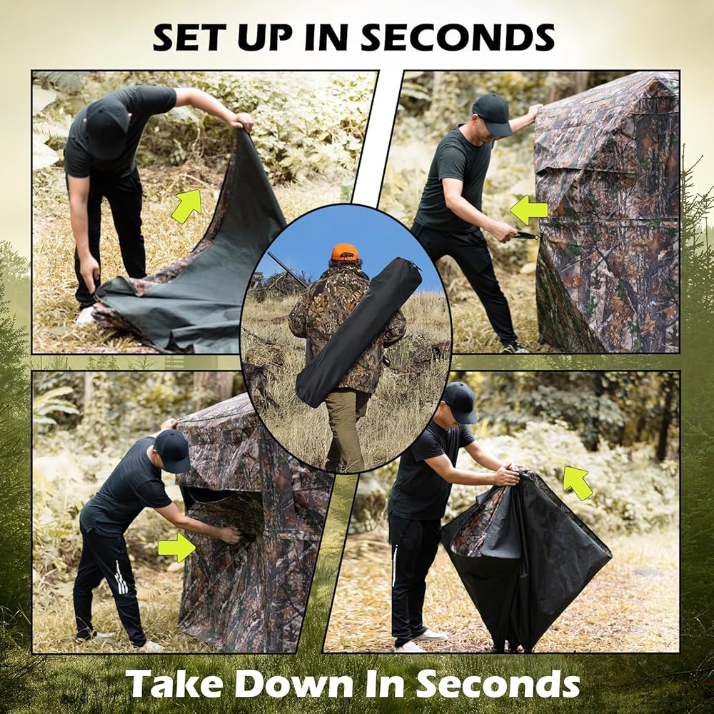 • 🍂 STABLE AND DURABLE - Made of robust fiberglass rods, which are lightweight yet robust enough to support the tent. The ground blind surface is wear-resistant to withstand wind, snow, rain and etc outdoor weather and scratches from branches. UNIQUE POP UP DESIGN without a complex procedure, enables you to easily set up in seconds and it can also be easily folded back for storage.