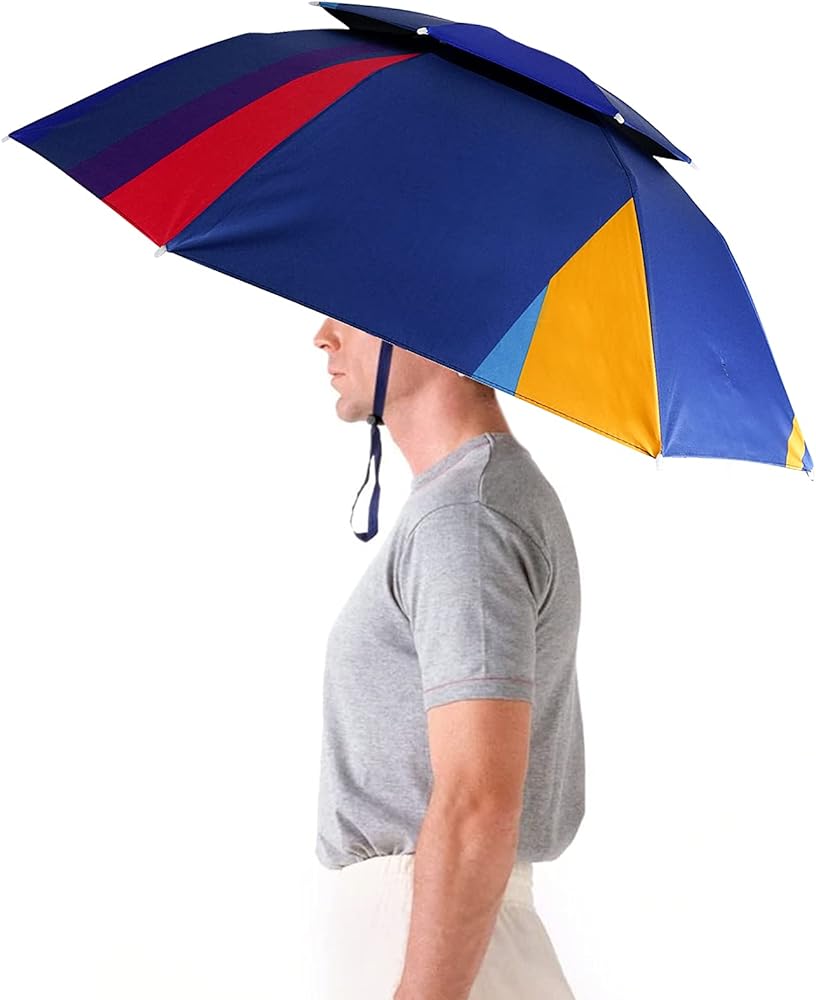 UPGRADED RUBBER HEADBAND - Our headwear has an adjustable rubber head band for most adults (head less than 22 inches in diameter), there is also a chin strap for you to tighten to keep the umbrella hat from wobbling