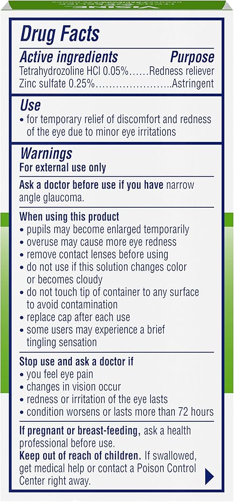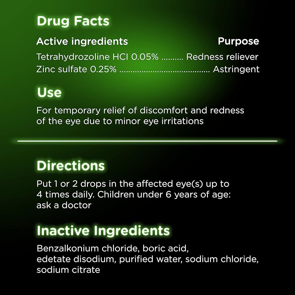 They are also formulated with .05% tetrahydrozoline hydrochloride, the same active ingredient used in Visine Red Eye Comfort to relieve red eyes