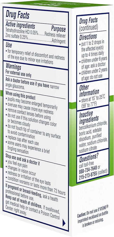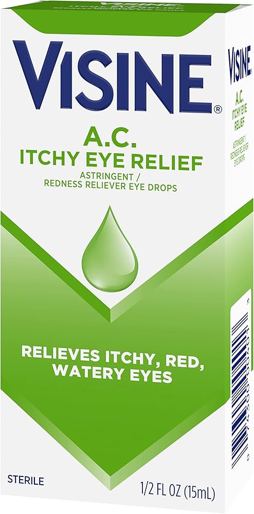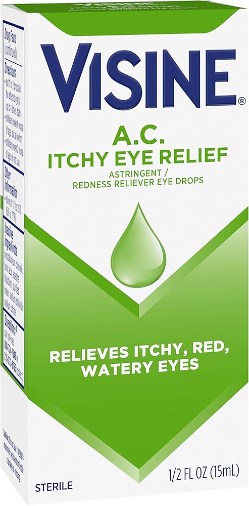 Visine A.C. Itchy Eye Relief Astringent Eye Drops provide temporary relief from itchy, red and watery eyes. Backed by 60 years of science and expertise, these eye drops are uniquely formulated with.25% zinc sulfate astringent as well as.05% tetrahydrozoline hydrochloride, the same active ingredient used in Visine Red Eye Comfort to help relieve red eyes. The small 0.5-fluid ounce bottle slips easily into a purse, pocket, backpack or desk for relief anywhere, even on the go. Visine A.C. Itchy Eye Relief Eye Drops provide effective, multi-symptom relief of itchy, red, watery eyes.