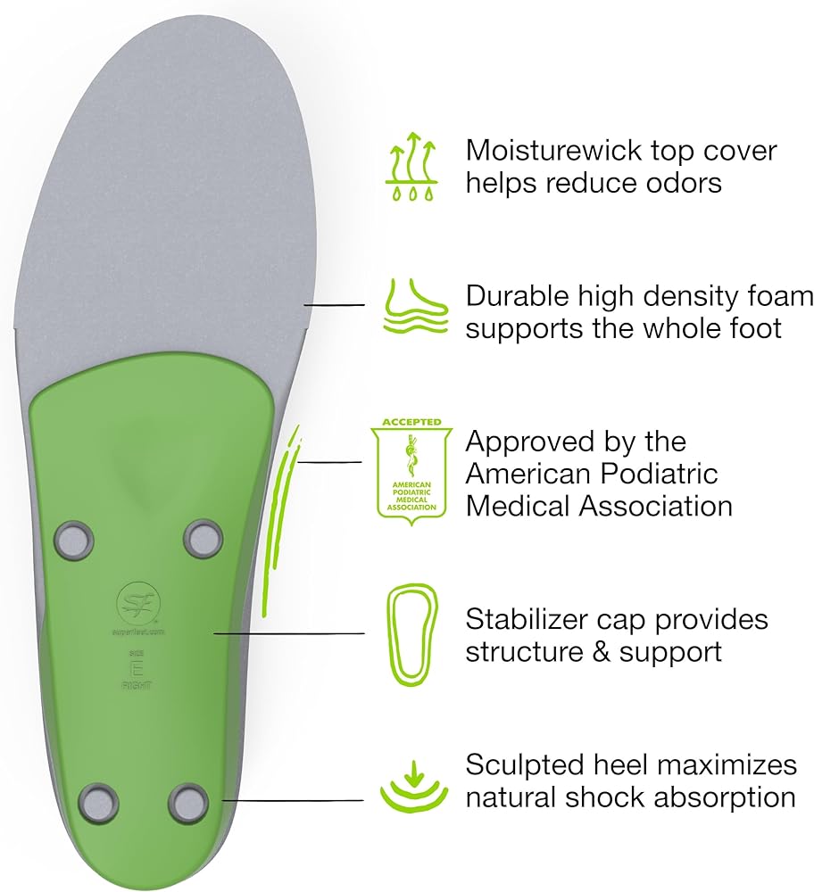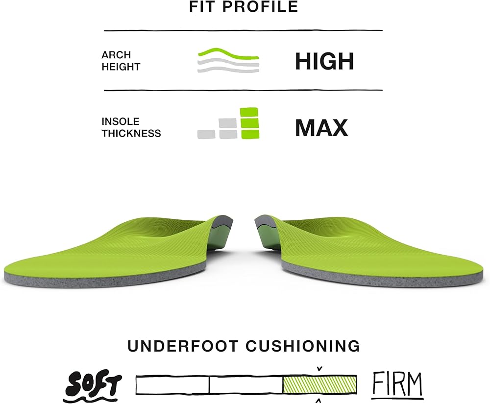 One of the first and most well-known Superfeet, GREEN insoles offer professional-grade orthotic support for shoes to fit and feel better. An excellent choice for those with high arches, these original shoe inserts are an affordable, effective alternative to custom orthotics. They are designed to replace the sockliner in roomy to moderate-fitting shoes. Trim to fit your size. Features Deep Heel Cup: Wide and deep heel cup works with your body's natural cushioning for maximum support High Arch Superfeet Shape: High arch orthotic support helps stabilize the foot, reducing stress on feet, ankles, knees and back Durable Construction: Superfeet insoles keep their shape, delivering reliable support and comfort for up to 12 months or 500 miles, whichever comes first Stabilizer Cap: Acts as the base of the insole that supports the rearfoot and provides structure and stability to the foam layer High-Density Foam: Closed-cell foam provides a firm foundation to support the foot for long-lasting comfort