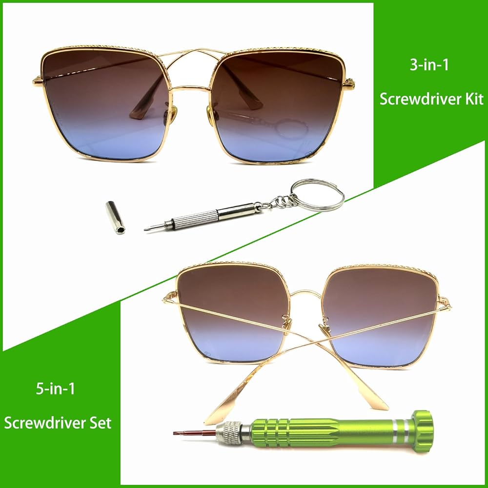 Product List: The eyeglasses repair kit includes two 5-in-1 precision screwdriver sets, metal tweezers, and a 3-in-1 keychain screwdriver kit for easy carrying.