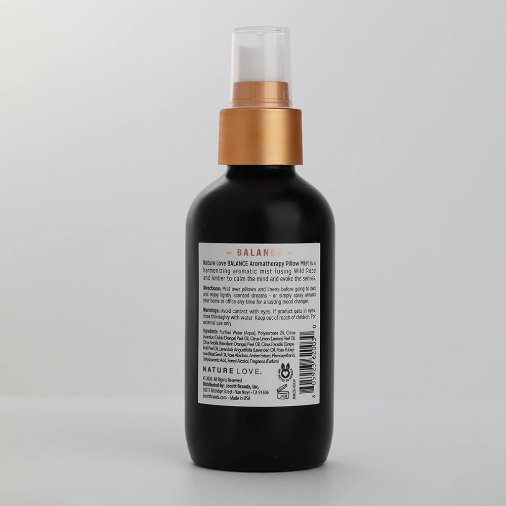 Nature Love BALANCE Aromatherapy Pillow Mist is a harmonizing aromatic mist fusing Wild Rose and Amber to calm the mind and evoke the senses. Directions: Mist over pillows and linens before going to bed and enjoy lightly scented dreams - or simply spray around your home or office any time for a lasting mood changer. Warnings: Avoid contact with eyes. If product gets in eyes, rinse thoroughly with water. Keep out of reach of children. For external use only.