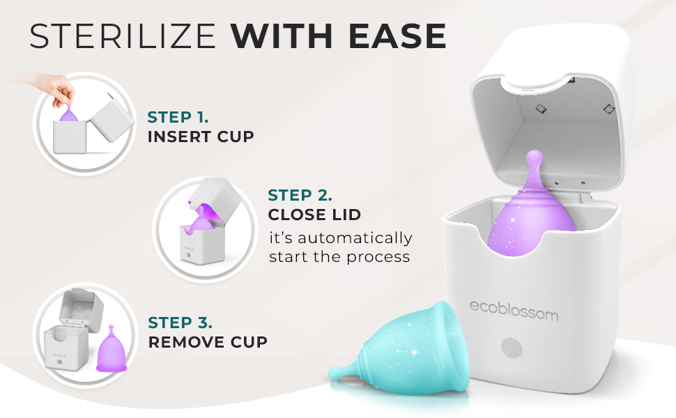 Ecoblossom Menstrual Cup Sterilizer - Modern Menstrual Cup Cleaner Unscented Sanitizer - 2-Minute Automatic UV Wash - Holder Fits Small Soft & Large Period Disc - UV Wipes Out 99.9% of Germs (+ Cups)