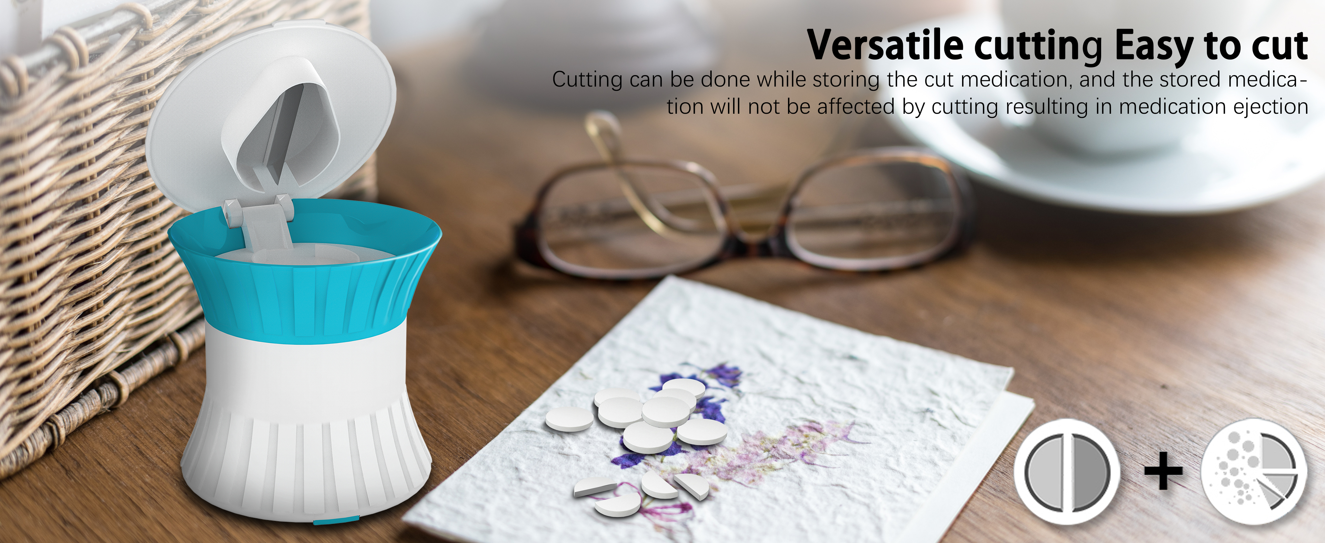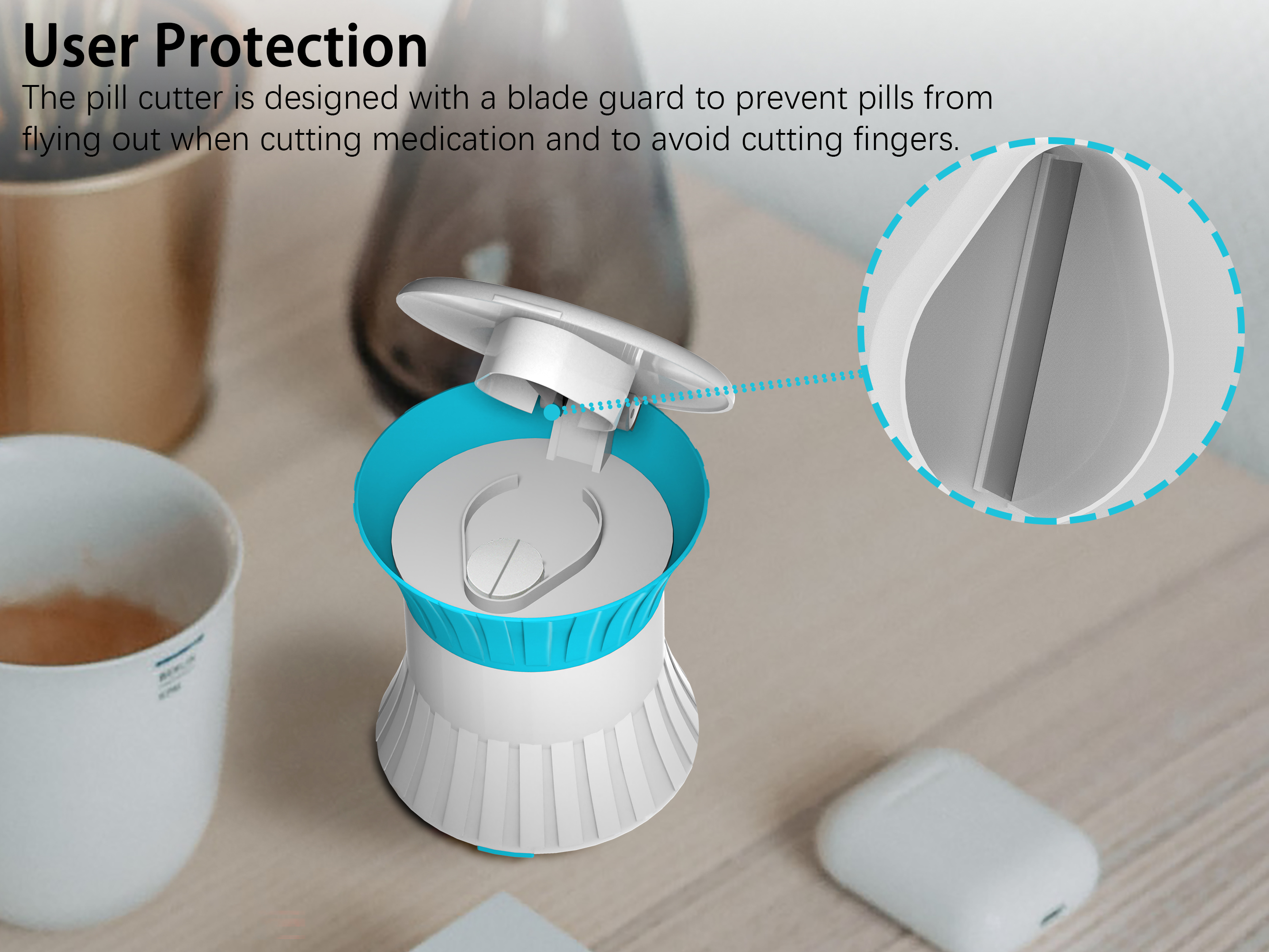 I like that it has a lid that you can put on so you don't lose anything. It's very small enough to keep in your purse or medicine cabinet, the pill cutter comes with a blade guard design that prevents pills from flying out when you cut them and also prevents you from cutting your fingers, protects your fingers and your medication, and the shape is very cute and privacy-protecting as well. Stainless steel blades, blades never dull. Sturdy and durable, long service life.