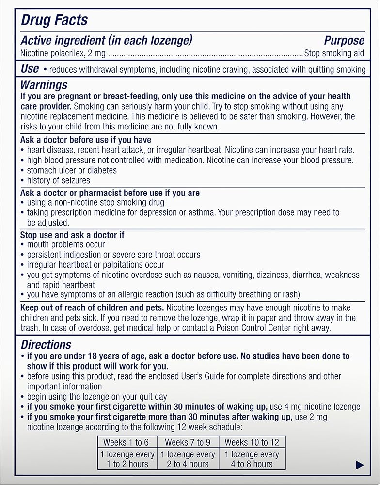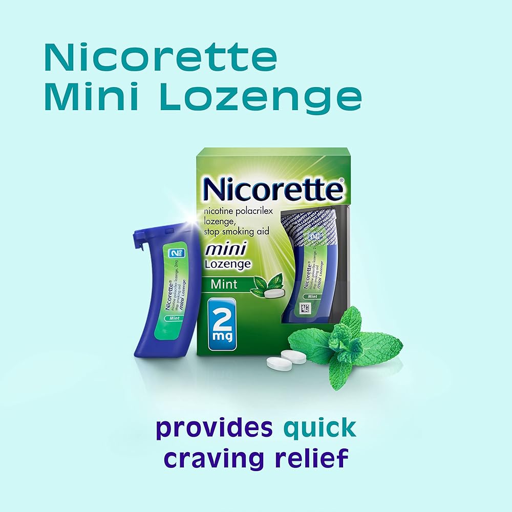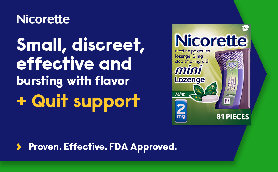 Nicorette 2 mg Mini Nicotine Lozenges with Behavioral Support Program are small and discreet stop smoking aids that relieve sudden cravings quickly to help make quitting easier. Each lozenge delivers a therapeutic dose of nicotine that allows you to control your intake, curb cravings and relieve withdrawal symptoms associated with quitting smoking. These smoking cessation lozenges come in a refreshing Mint flavor and continue working long after fully dissolved, helping you gradually diminish your dependence on nicotine over time. Available in a portable dispenser that fits easily in a pocket or purse, these stop smoking lozenges are perfect for use on the go. If you smoke your first cigarette more than 30 minutes after waking up, start with a 2 mg nicotine lozenge as part of your OTC nicotine replacement therapy. These quit smoking products also feature a Behavioral Support Program for added support to help your quit stick. Use at least nine of these quit smoking aids per day for the first six weeks as part of a 12-week quit program accompanied by behavioral support. Start stopping with Nicorette Nicotine Lozenges, a stop smoking aid.