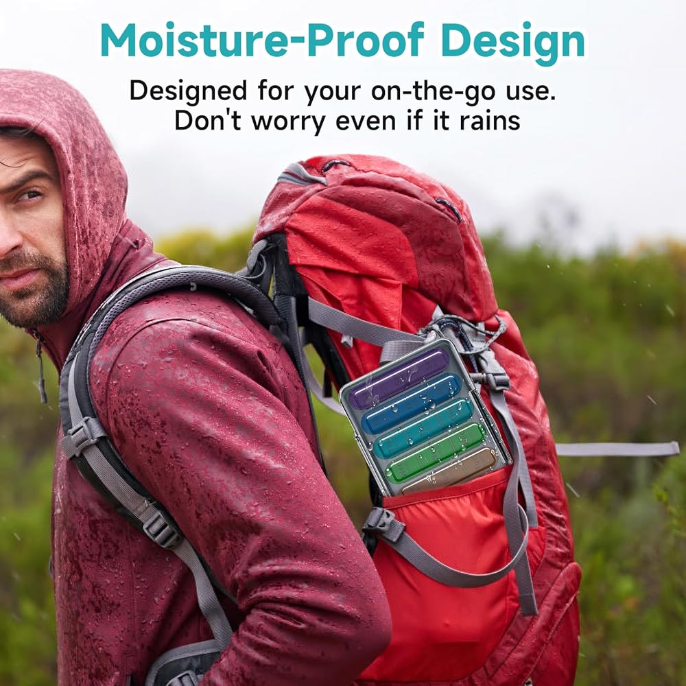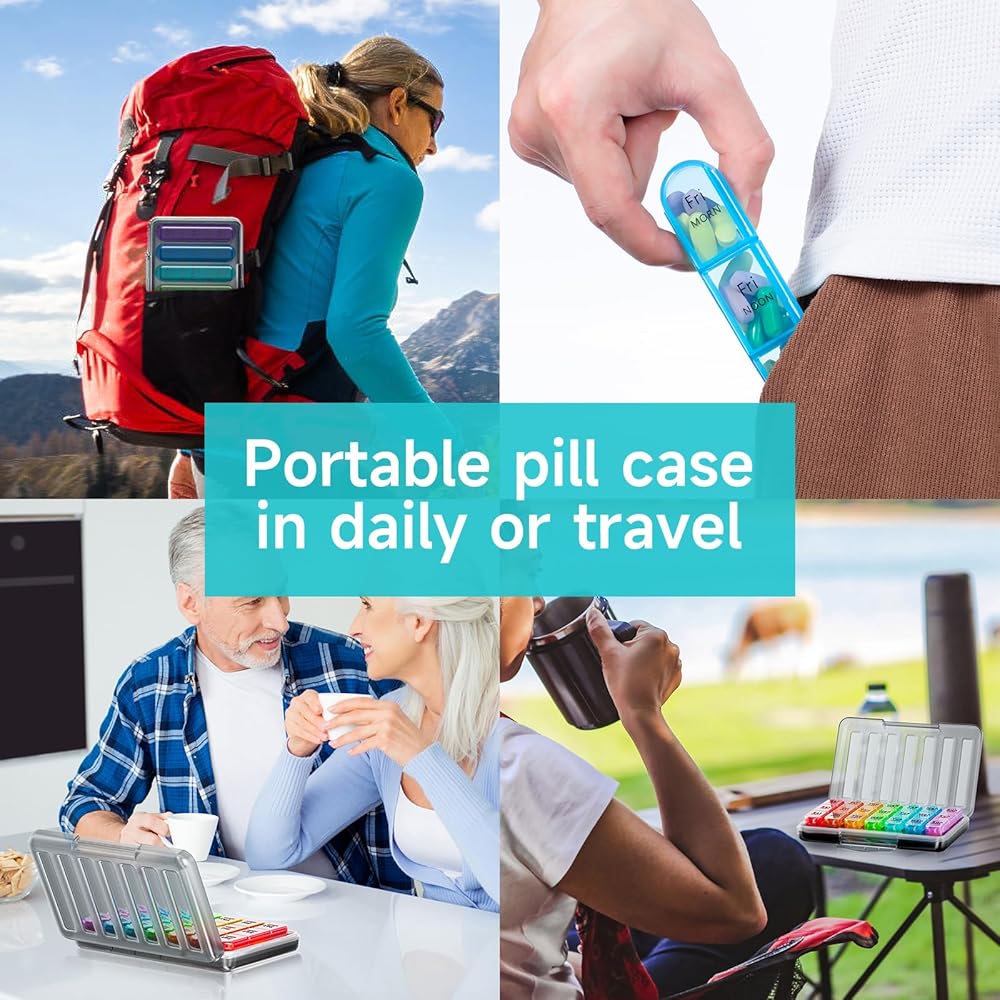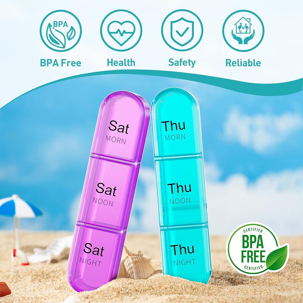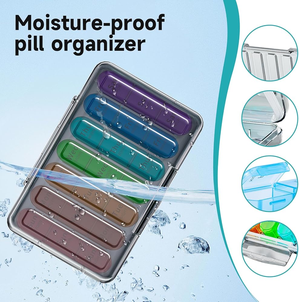 [Moisture-Proof Pill Organizer] The Weekly Pill Box 3 Times a Day is designed to protect your medication from moisture. The thickened silicone ring surrounding the 7 day pill box provides an additional layer of protection, this medicine organizer box keep your pills dry.You can take it to a humid place and not worry if the medication gets wet.