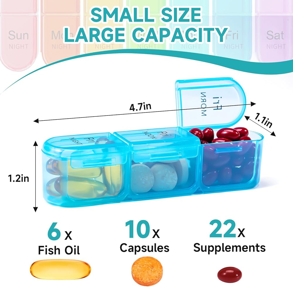 [Large Capacity Daily Pill Box Organizer] Large 3 times a day pill organizer 7 day each compact pill boxes can store up 6 pcs large fish oils or 22 pcs supplements,Meanwhile,the inner 7 day pill case fits in your pocket or bag, so you can keep your daily pills on hand at times!