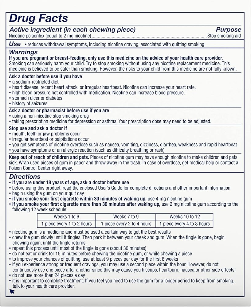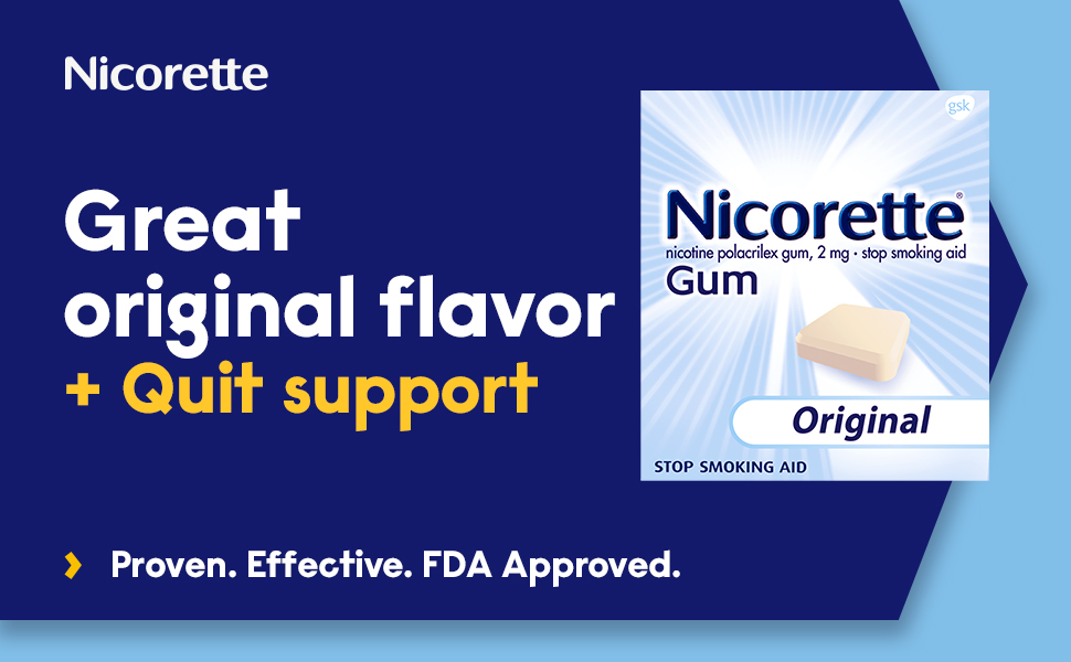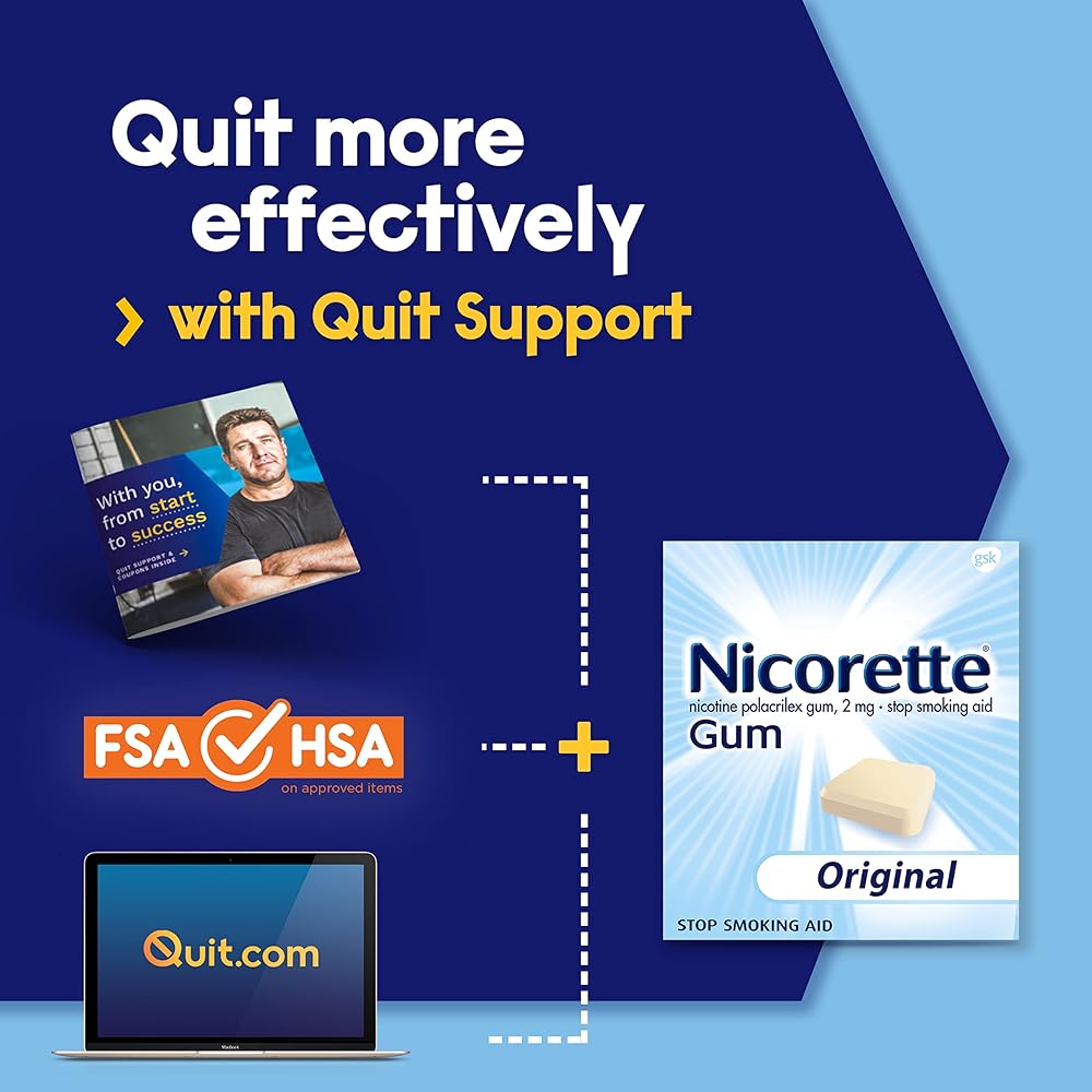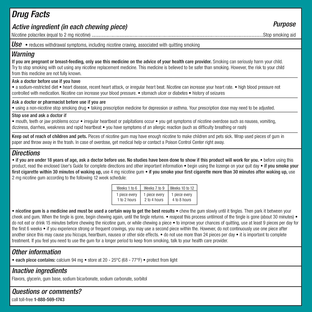 Nicorette 2 mg Nicotine Gum Stop Smoking Aid with Behavioral Support Program helps you control your nicotine intake while enjoying the pleasant relief of chewing to help make quitting easier. Made with a special formula to help you gradually kick your smoking habit, this stop smoking gum releases a small, therapeutic dose of nicotine that is slowly absorbed by the body. This OTC nicotine replacement therapy allows you to manage your daily nicotine intake while soothing the cravings, anxiety, frustration, depressed mood, irritability and restlessness associated with quitting smoking. This unflavored quit smoking gum gives you the choice to chew a second piece within the hour if you feel strong or frequent cravings. This 2 mg nicotine gum is a great smoking cessation aid for those who smoke their first cigarette more than 30 minutes after waking up. These quit smoking products also feature a Behavioral Support Program for added support to help your quit stick. Complete a 12-week quit program with behavioral support to increase your chances of success. Always follow label directions. Start stopping with Nicorette Nicotine Gum, a stop smoking aid.