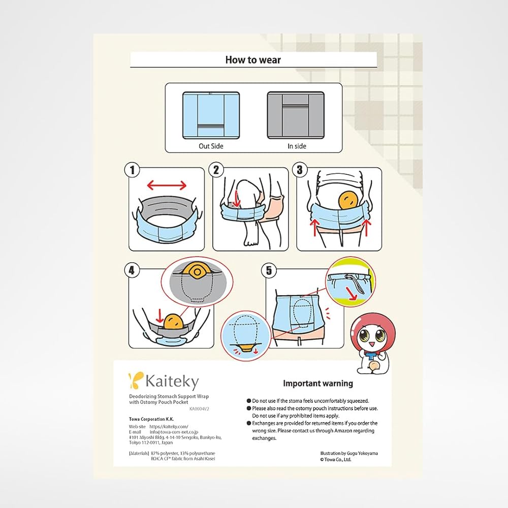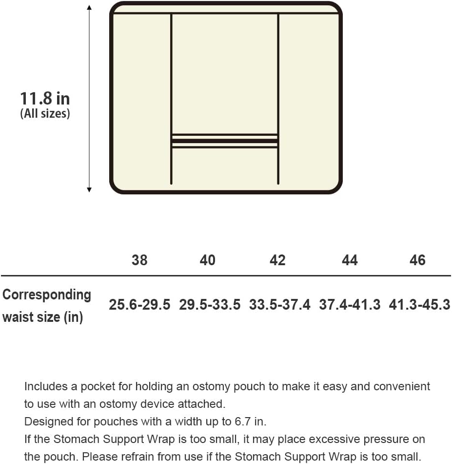 Made with high-performance fabric (ROICA CF fabric by Asahi Kasei) that powerfully neutralizes odors. Includes a pocket to keep the ostomy pouch off the skin. Stretchy fabric stretches as the pouch expands for worry-free use. If the Stomach Support Wrap is too small, it may place excessive pressure on the pouch. Please refrain from use if the Stomach Support Wrap is too small.