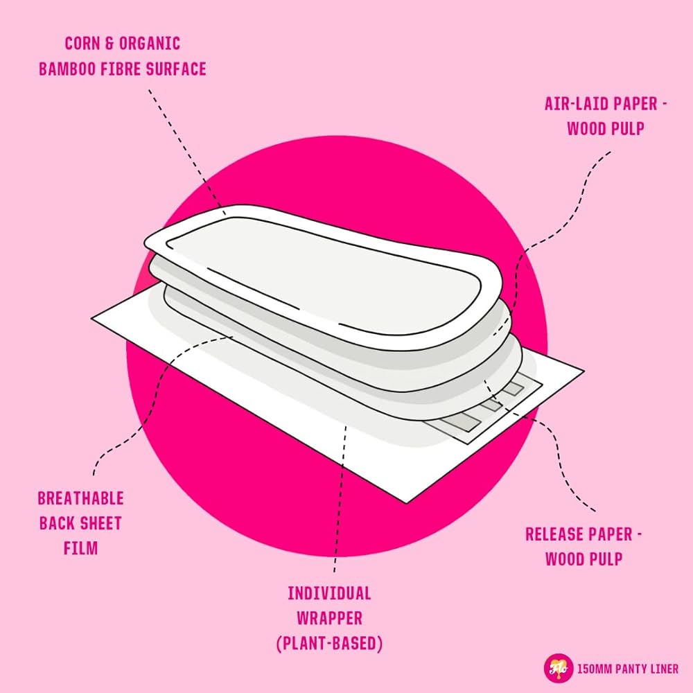 Organic: 100% Organic Bamboo Sustainable Panty Liners wrapped in plant-based, compostable, plastic-free film. PETA-certified Vegan and cruelty-free.