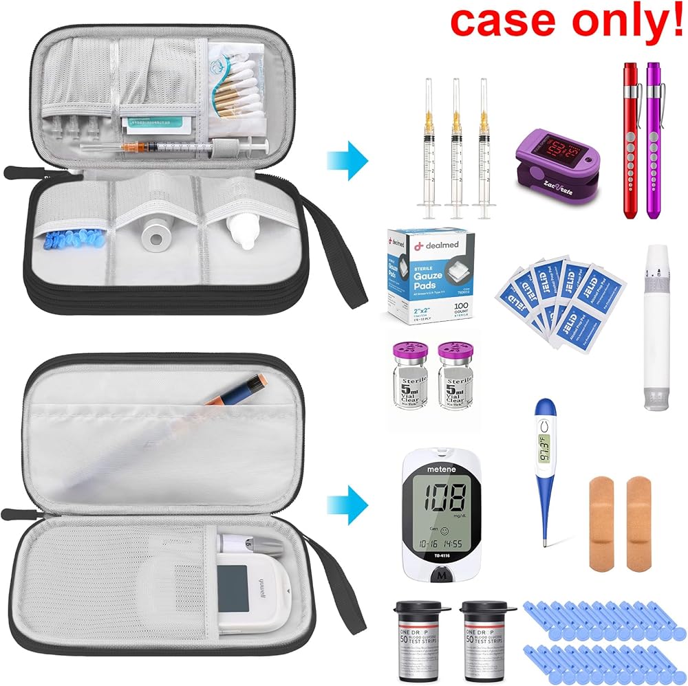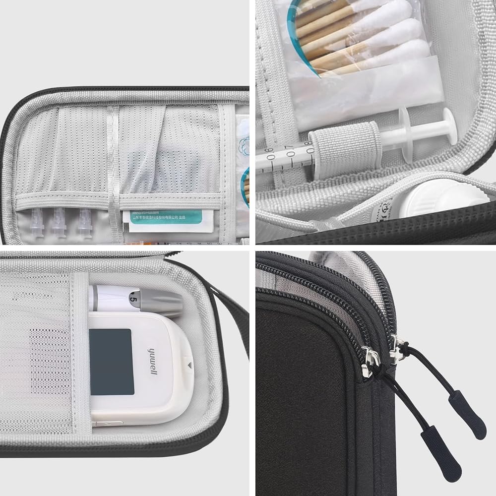 Scientific Design: Double zipper design provides easy access to insert and remove your gluco meter, glucose monitor, insulin pen needles, insulin syringe, needles, blood glucose meters, lancets, testing strips, ventolin Inhaler, alcohol wipes, allergy medicine and other diabetic testing accessories. comes with a comfortable hand strap for easy carrying.