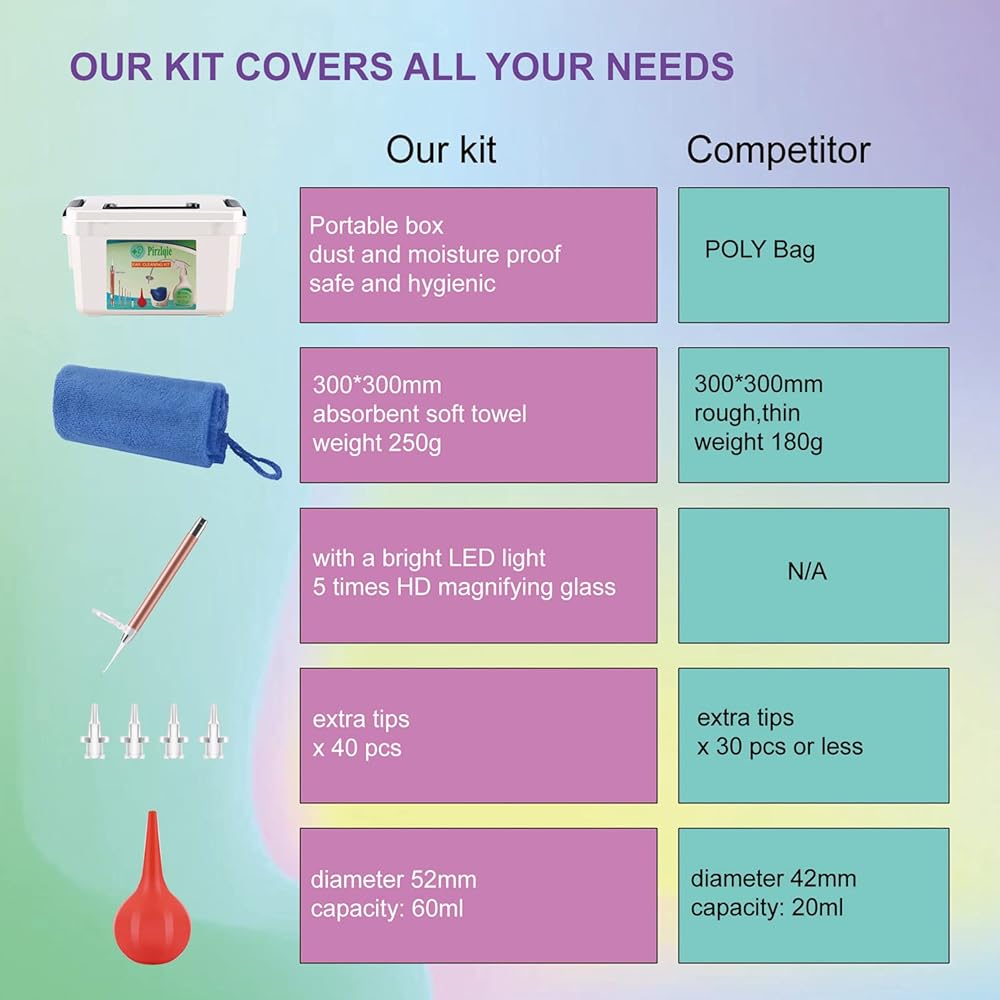 Complete ear cleaning kit:All the tools put it in the storage box for effective ear wax removal.Includes(storage box,curette kit,basin,microfiber towel,ear wash spray bottle,bulb syringe and 40 disposable tips.)
