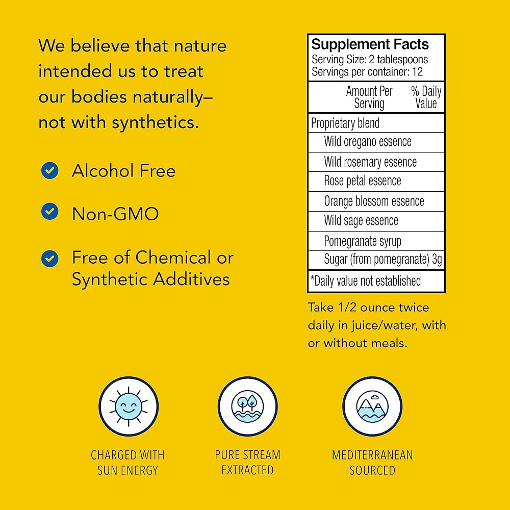 Full Ingredient List; Wild oregano essence, wild rosemary essence, rose petal essence, orange blossom essence, wild sage essence, pomegranate syrup; Free of all chemicals, pesticides & additives; Non-GMO