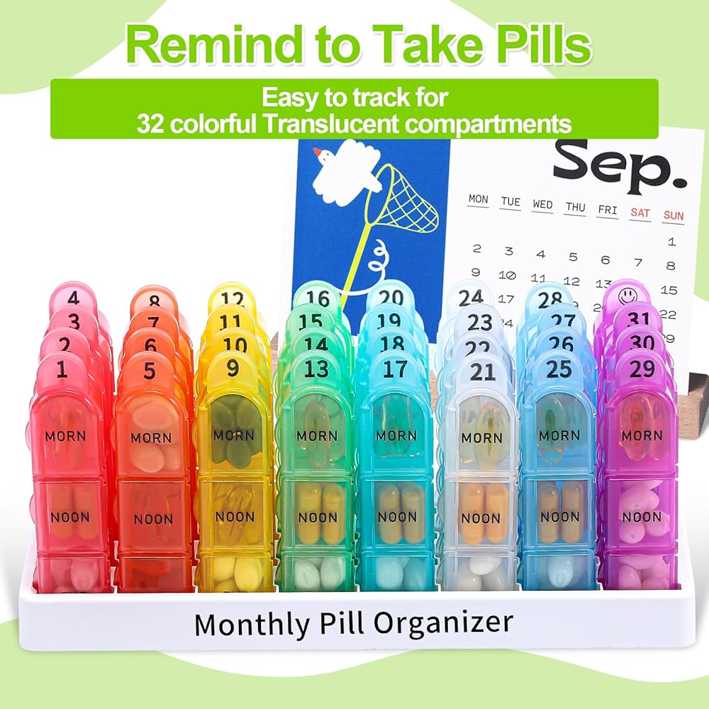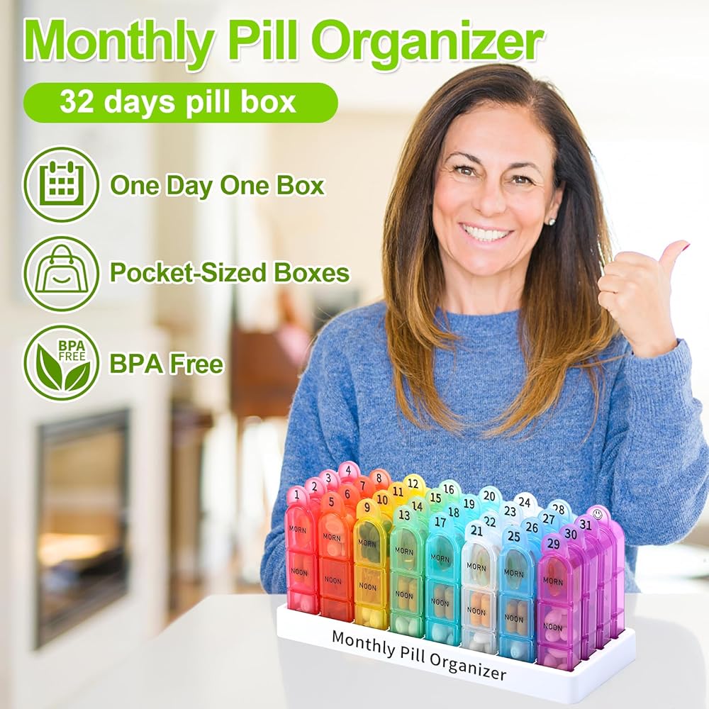 "[Large Capacity Pill Box]The monthly pill organizer has 32 separate daily pills organizer for a monthly, total 128 large compartments. Each slot can store 3 fish oils and at least 10 small tablets. Plenty of room for all of your meds and keeping yourself organized.