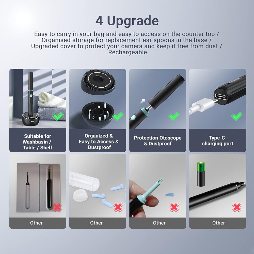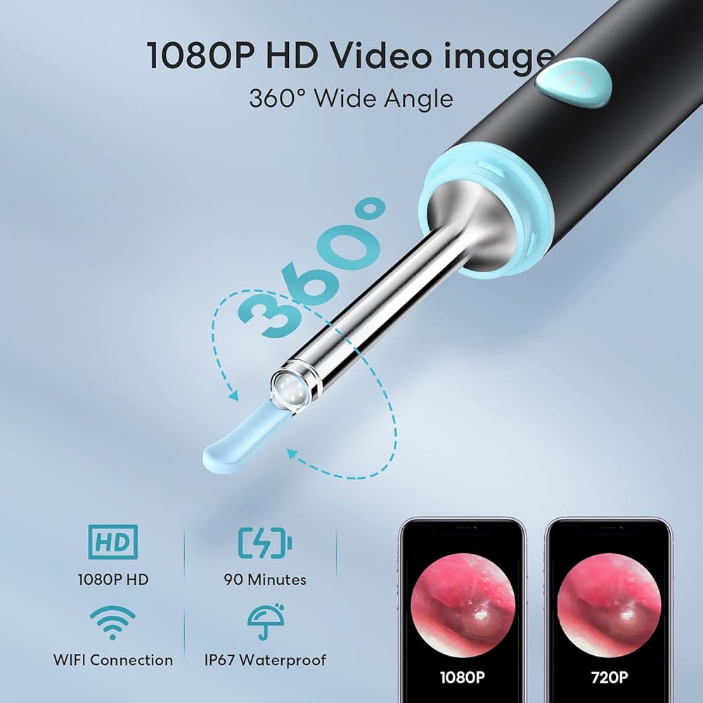 360°Wide Angle & 1080P FHD Camera: AIFINI ear wax removal camera has a 360° wide angle lens and is equipped with 6 thermostatic LED to help you illuminate the ear canal, with a large field of view, intelligent 6-axis gyroscope, capturing HD pictures and videos in real time, Help with ear problems.