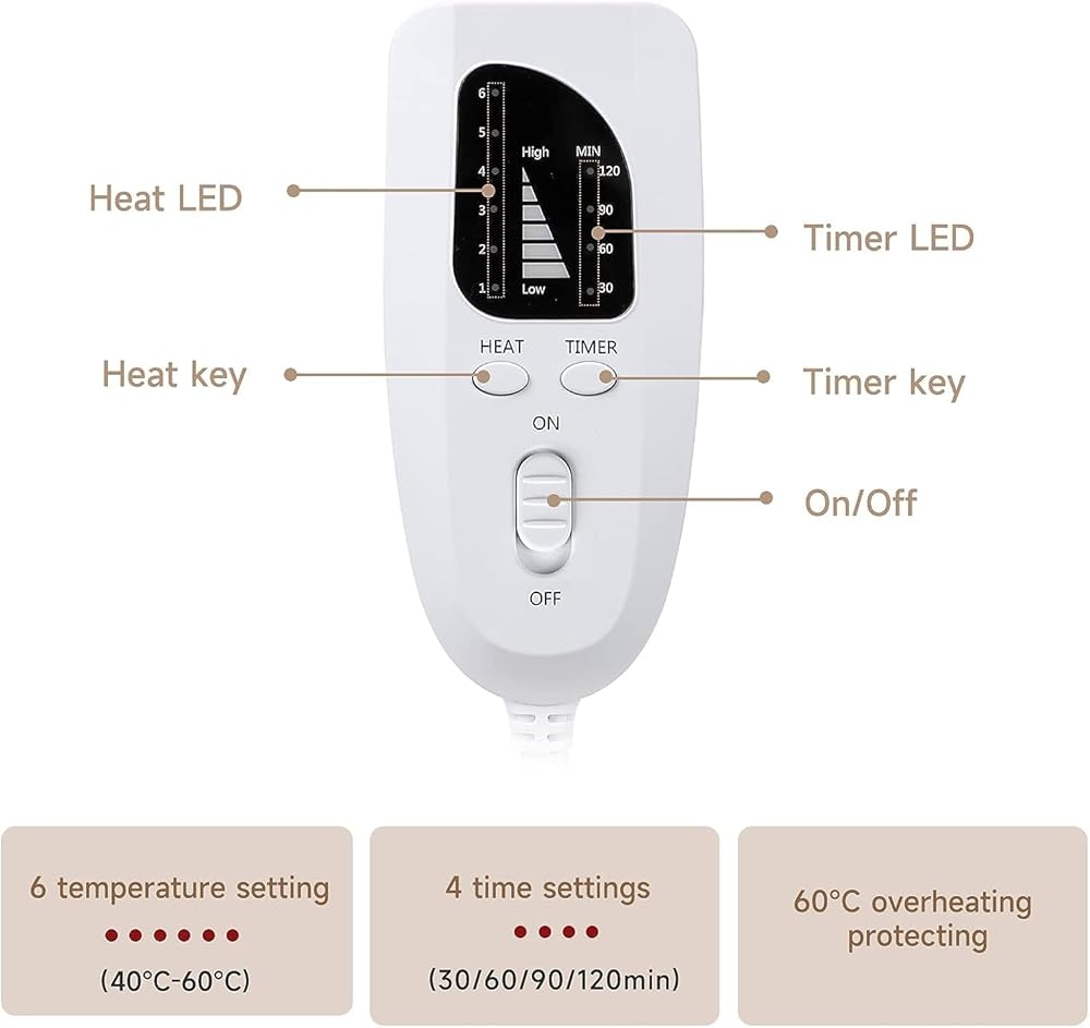 【Adequate Heat and safety】 Heat Pad will be heating in a second after turning on, features 6 heat settings (104℉- 140℉) to meet your different needs, and 4-timing settings (30-60-90-120 mins) , it will safely auto-turn off in setting time, which avoids excessive heating. The back heating pad has an overheating protection system as well as constant temperature protection, delivers penetrating soothing heat, and maintains at the pre-set temperature well. 6ft wire helps to keep activity free.