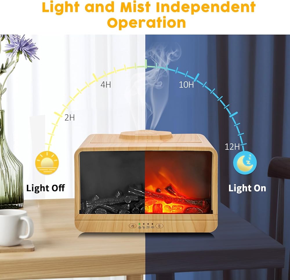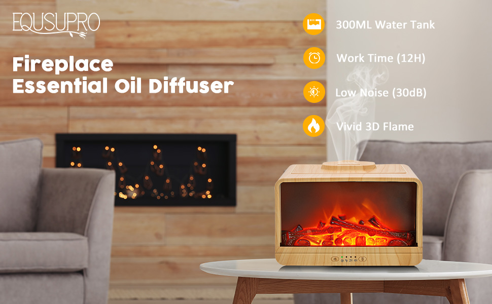 【Flame Fireplace Design】EQUSUPRO fireplace essential oil diffuser designed with vivid flame light to light up your room with soothing and cozy atmosphere and relaxing fragrance. This fireplace oil diffuser with wood grain cover will be a stylish decor to contemporary home, office, gym, spa or studio.