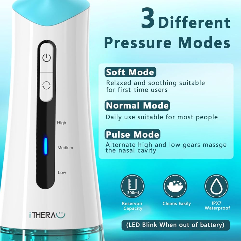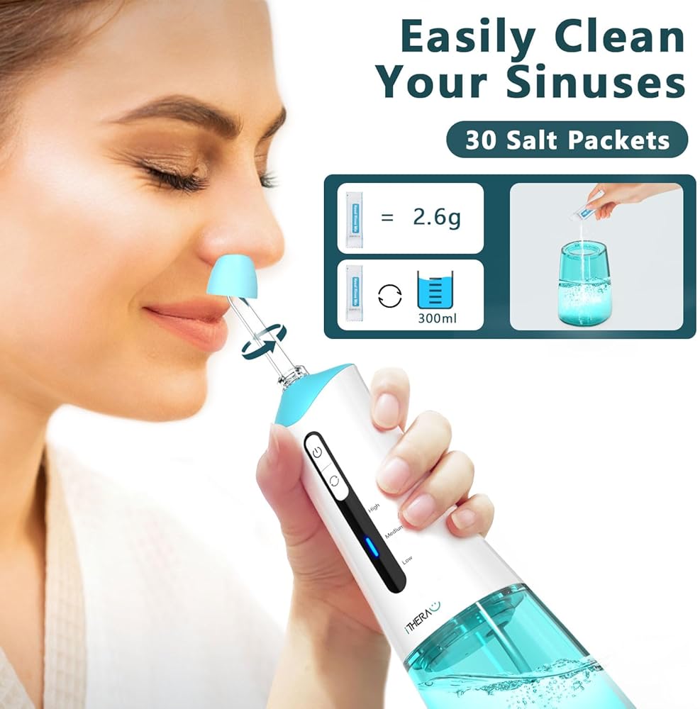 iTHERAU Electric Nasal Irrigation System for Nose Discomfort Relief & Nasal Care,Neti Pot Sinus Rinse Kit,Portable Nose Cleaner,3 Modes for Sinus Rinse,Nasal Irrigator with 30 Nasal Saline Packets