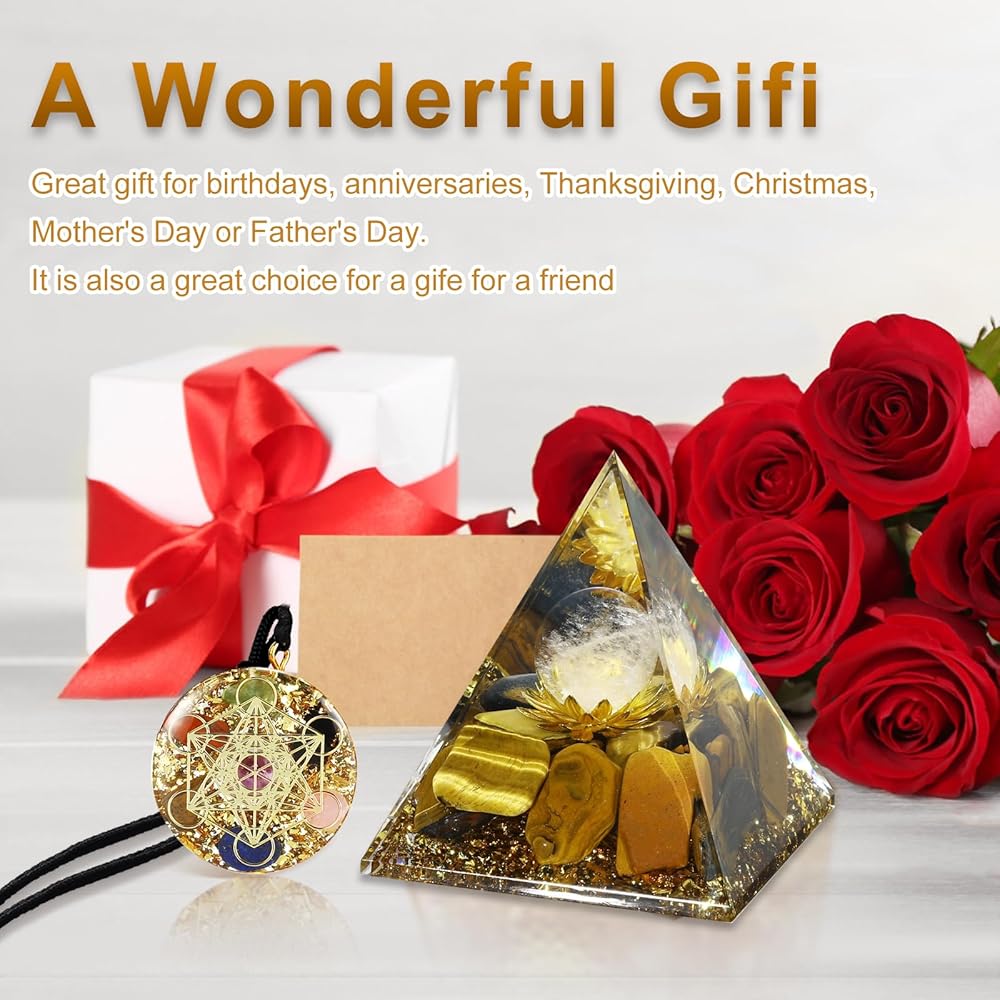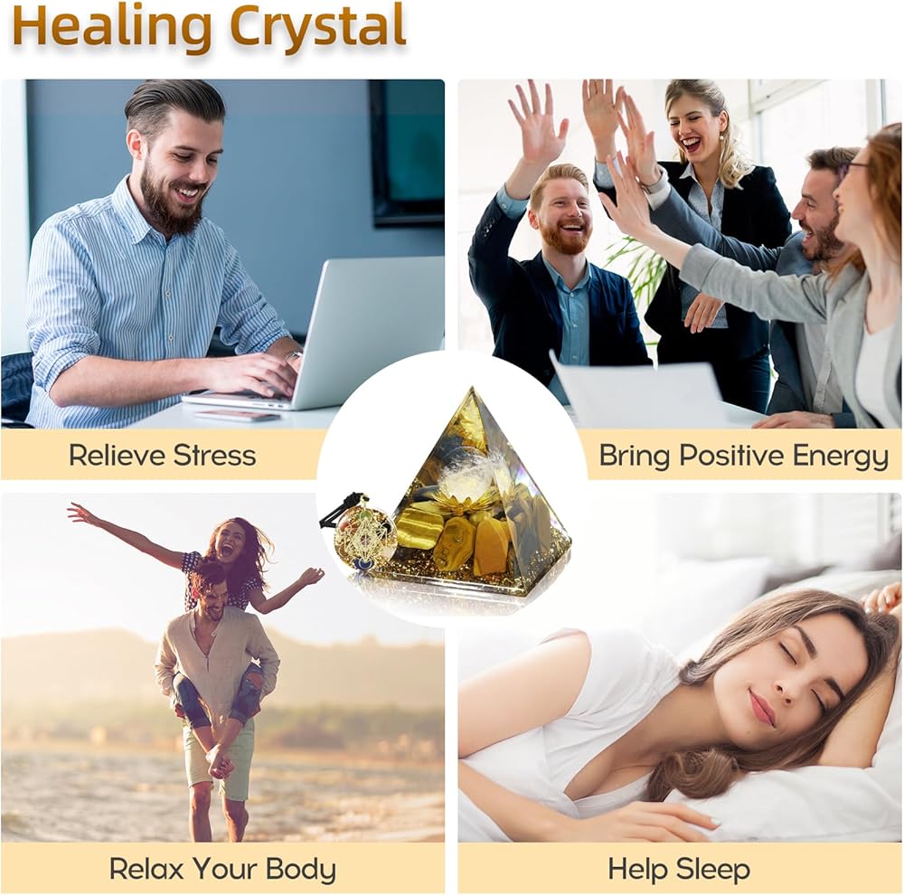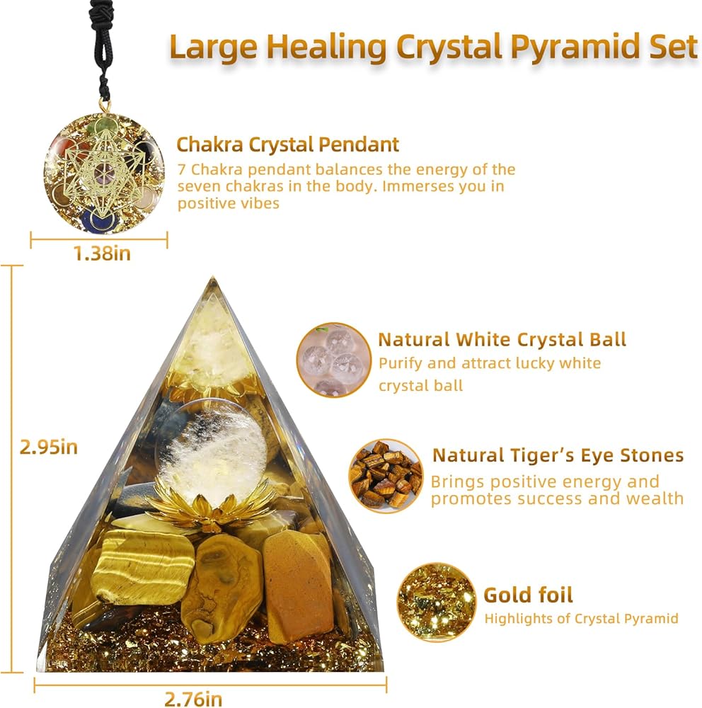 Hopeseed Large Orgone Pyramid for Positive Energy, Orgonite Natural White Crystal&Tiger's Eye Stones Healing Crystals Pyramid Set for Reduce Stress Chakra Healing Meditation Attract Lucky