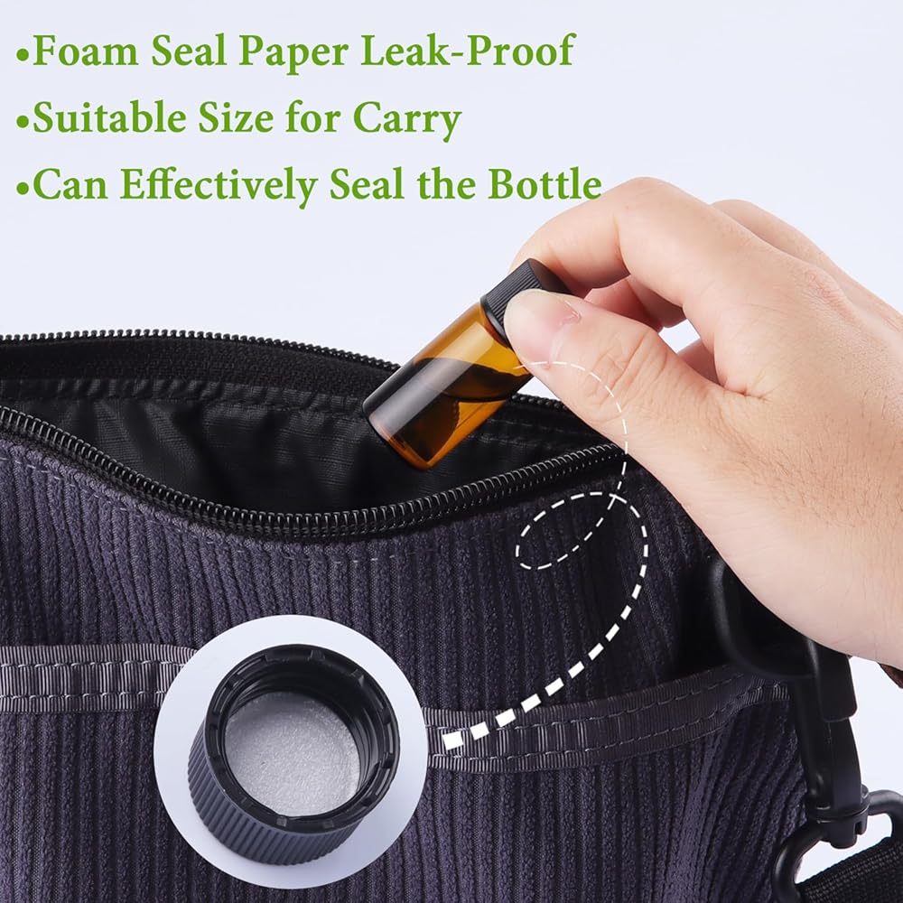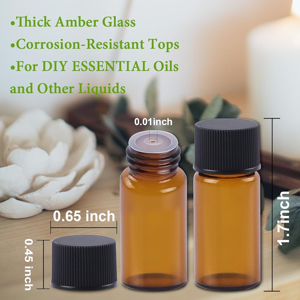 🌷【Convenient and Portable】: The bottles dimensions is 1.7*0.65*0.65 inch,base is 0.65 inch,orifice is 0.01 inch,cap is 0.45*0.65*0.65 inch.The essential oil bottle capacity is 5ml and compact and lightweight design.Our sample bottles are perfect for Perfect for travel or daily use,allowing you to take your favorite essential oils with you wherever you go.Fits easily in your pocket,purse or bag.