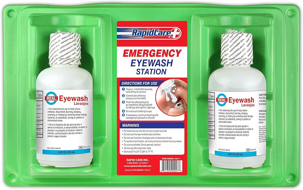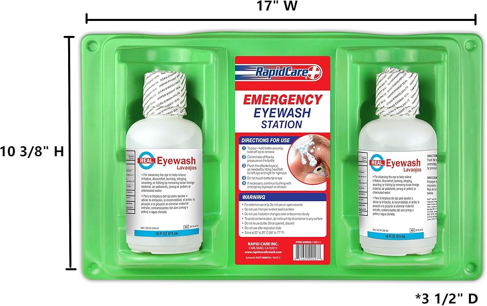 The Rapid Care First Aid mountable eye wash station comes with 2 -16 oz. Bottles of sterile isotonic buffered solution for flushing or irrigating eyes to clear eyes of foreign material such as dust, pollen, and chemicals and to relieve itching and burning of eyes and skin.