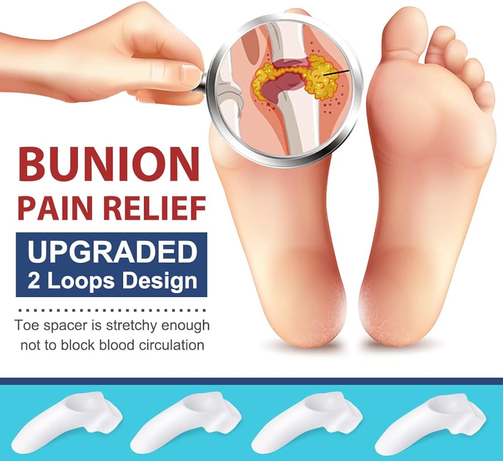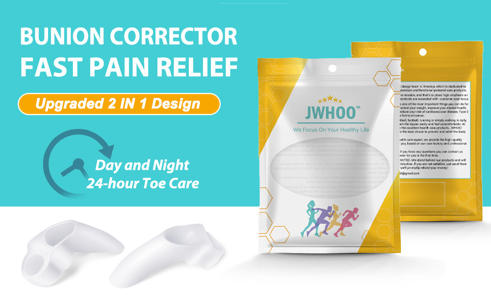 【THE LATEST DESIGN IN THE FOOT HEALTH INDUSTRY】 The New Generation bunion corrector developed by JWHOO team of foot experts, has helped more than 100,000 people with mild bunions slow the progression or formation of bunions. Based on customers' feedback, our Upgraded toe separator are designed in contour of double loops for more stability and comfort, unlike ordinary one-loop bunion shield that tend to slip off or roll. Enjoying All-day foot comfort!