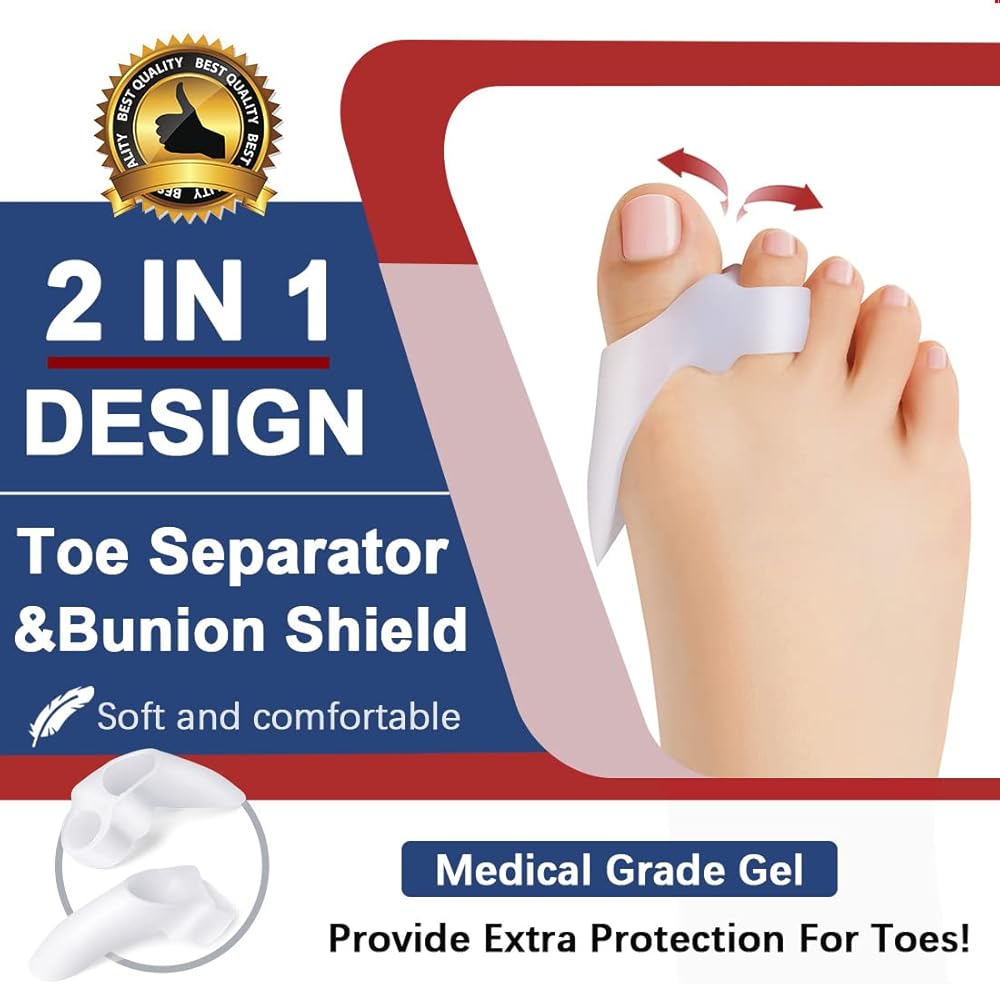 【PREVENT PAINFUL RUBBING】The Upgraded Double Loops design of toe separator provides a comfortable barrier to the big toe and second toe, protecting your feet from blisters, corns, calluses and rubbing, and preventing the big toe moving inwards to non-invasively correct your bunion pain issue. And once you put on our toe spacers, it stays against your toes.