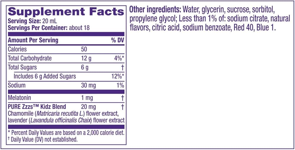 Every child deserves a good night's sleep. Vicks PURE Zzzs Kidz Liquid Melatonin is specially designed for kids with a low-dose of melatonin, is drug-free, and is shown to help your child fall asleep naturally. Kidz Liquid Melatonin comes in a great-tasting natural berry flavor that kids love. THESE STATEMENTS HAVE NOT BEEN EVALUATED BY THE FOOD AND DRUG ADMINISTRATION. THIS PRODUCT IS NOT INTENDED TO DIAGNOSE, TREAT, CURE, OR PREVENT ANY DISEASE.
