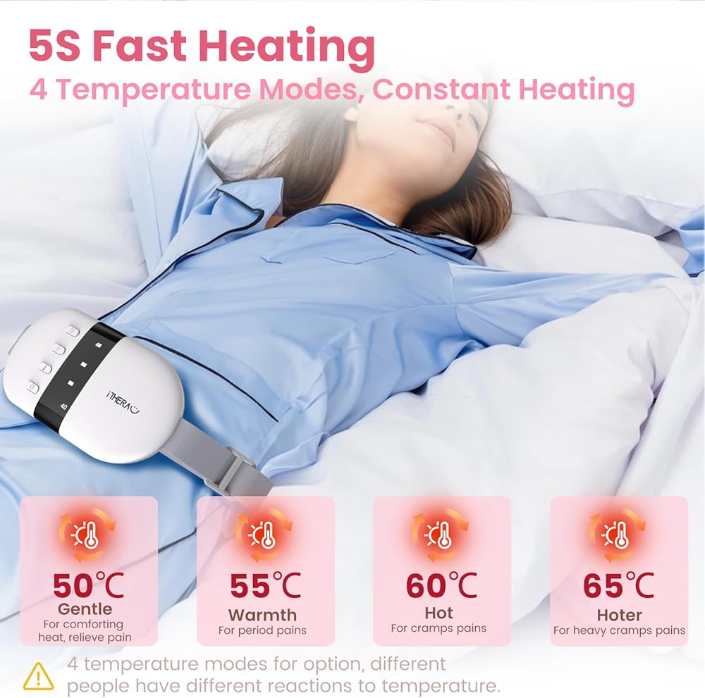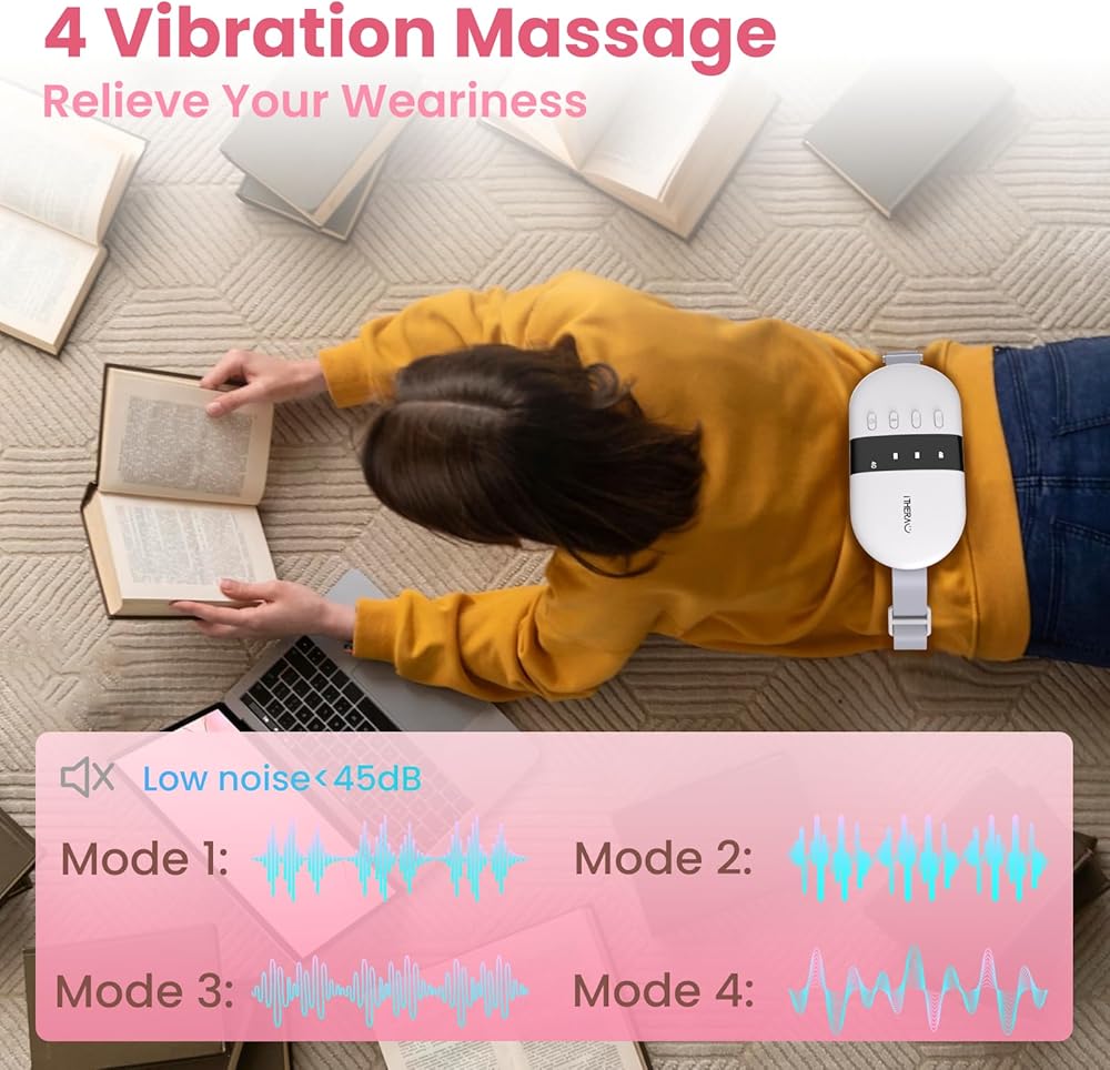 Constant Heat & Vibration Massage: With 4 vibration massage modes + 4 heating modes, the heating pad for period cramps allows you to customize a setting to achieve ultimate comfort, you only need to press the button to change the levels, the heating mode and massage mode can be used at the same time. 4 switchable temperatures: 122°F/50°C, 131°F/55°C, 140°F/60°C, 149°F/65°C, portable heating pad is suggested to use over clothes