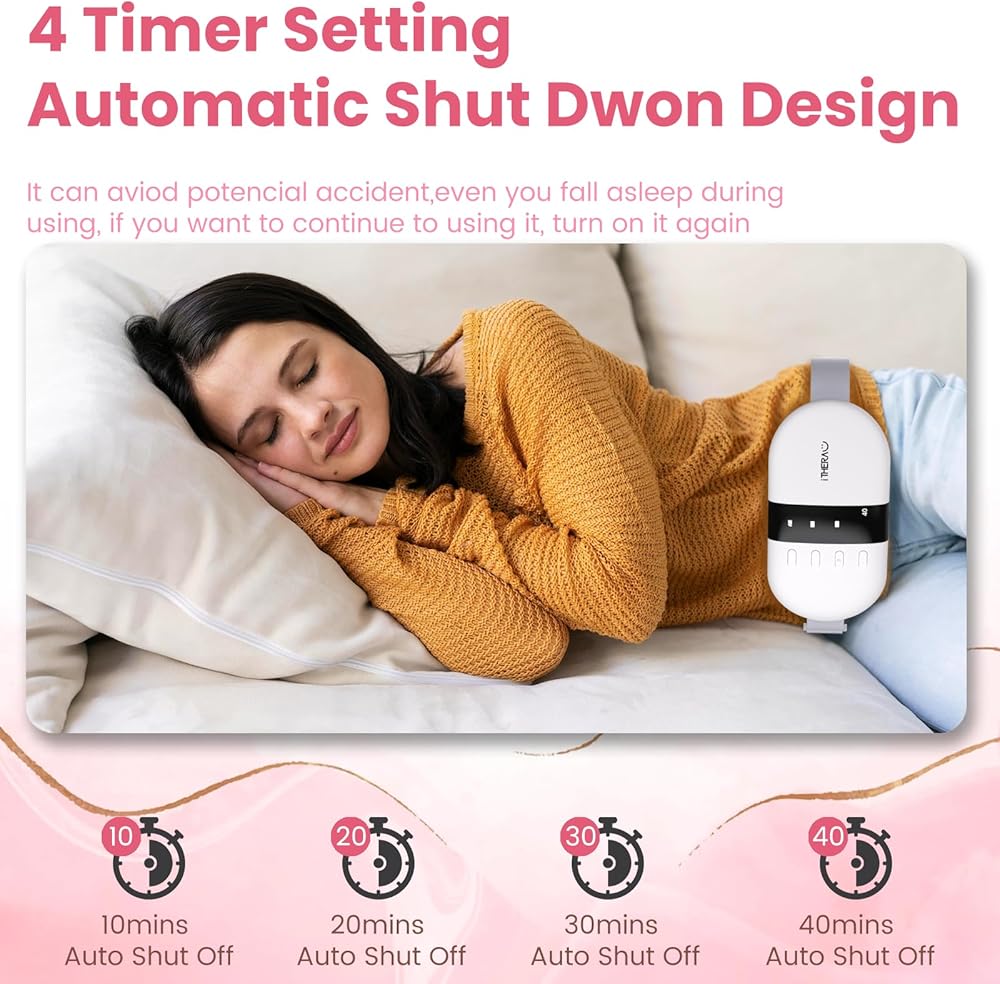 Safety & Timer: portable heating pad for period cramps has 10 mins, 20 mins, 30 mins, 40 mins time design, the period heating pad for cramps will auto shut off powers after the set working time, ensuring that the temperature doesn't get too high and making it safe and secure to use. If you want to use it again, just turn it on again