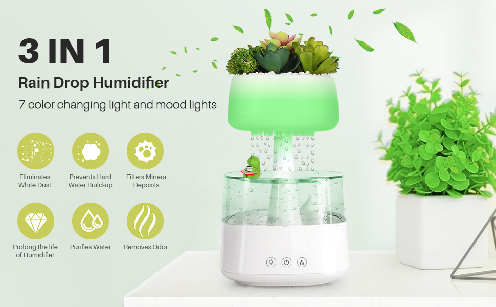 Aromatherapy Diffuser Humidifier, Rain Drop Humidifier Artificial Plants Night Light Essential Oil Diffuser,7 Color Cloud Humidifier with Filter Replacementr&Frog Ornaments&Mat for Home Bedroom Aroma