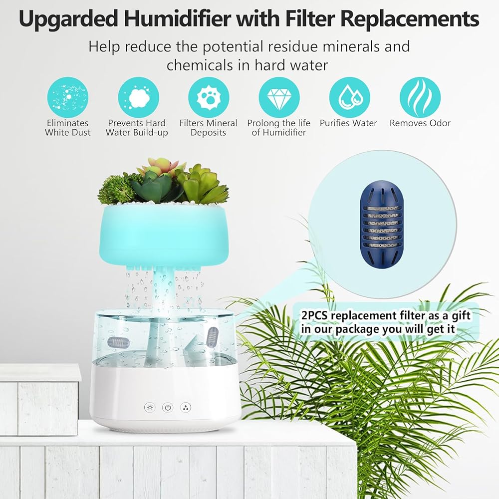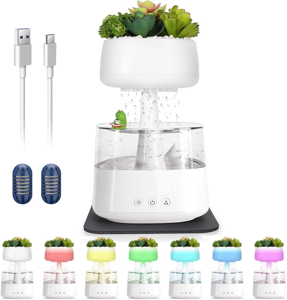 💦【MULTIPLE FREEBIES,WONDERFUL GIFTS】: Your rain humidifier comes with 1 *USB cable(5V 2A), 2 humidifer filter replacement, 1*Waterproof mat, 1*funny frog ornaments , 1*manual, 12 months warranty card and amazing customer support! Looking for the perfect gift? Look no further! This rain cloud humidifier and oil diffuser is an ideal present that everyone can enjoy.