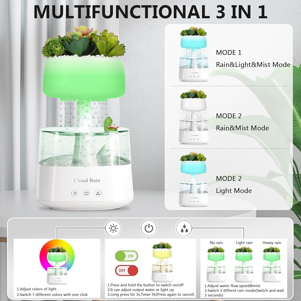 💦【UPGARDED 3 COMBINE MODE:RAIN&LIGHT&MISTHUMIDIFEr】Press the light button to switch the light color; 3 seconds long press the light button switching to breathing light mode. Press the rain button to adjust the size of the rain (heavy rain, light rain, no rain); 3 seconds long press the rain button adjusting the mist amount.Use it to improve the air quality in your home, mask pet or smoking odors, and protect your family from overly dry seasons, dust, and more! Ideal for salons, bedrooms, great rooms, living rooms, nurseries, offices and more.