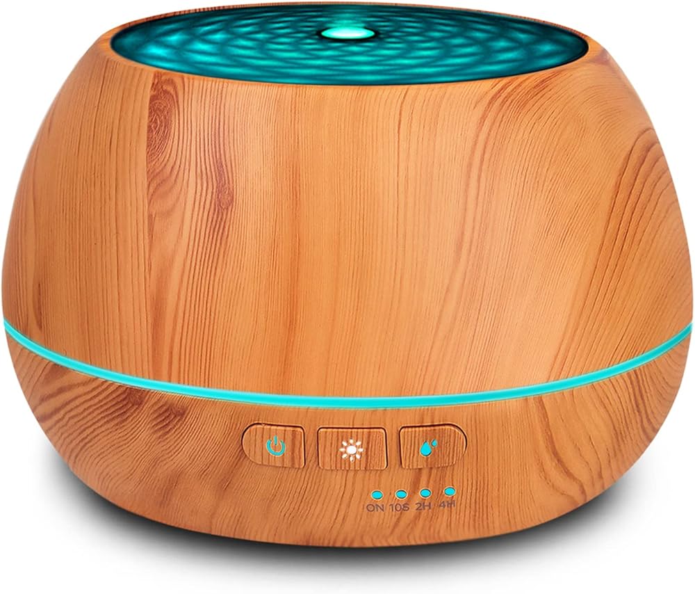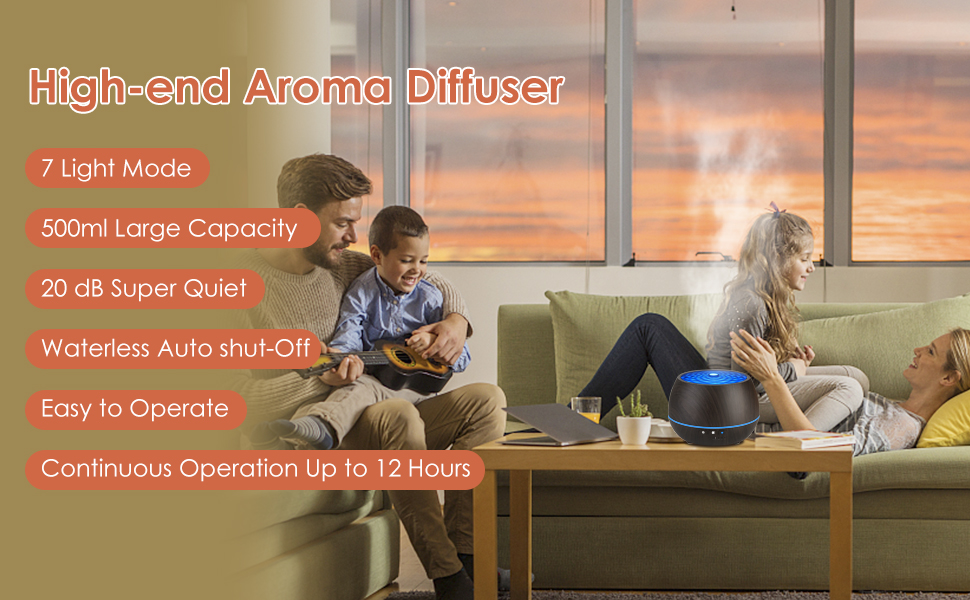 【LARGE CAPACITY & WATERLESS SHUT-OFF】: Our essential oil diffuser feature 500ml capacity, even in strong mist mode still work for 10 hours, and weak mist runs for 12-15 hours, 10 seconds intermittent working time can exceed 20 hours,works well,disseminating the aroma steam to your room, the cool mist humidifier will auto turn off when waterless, no risk of burns.
