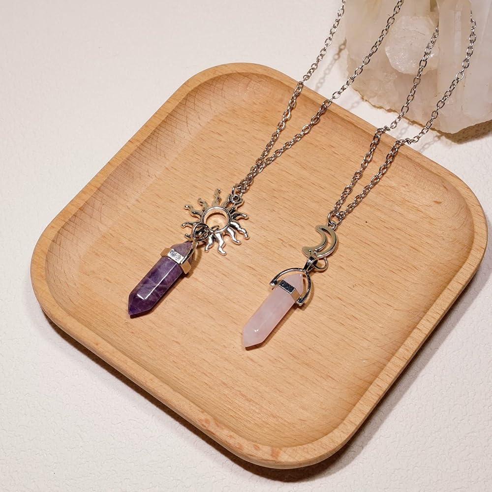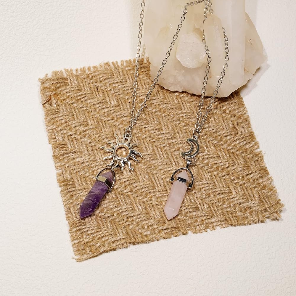 POZANKI 2 PCS BFF Healing Crystal Amethyst and Rose Quartz Point Pendant Chakra Necklaces, Sun and Moon Matching Necklace for Couples Best Friend Boyfriend Girlfriend Gift