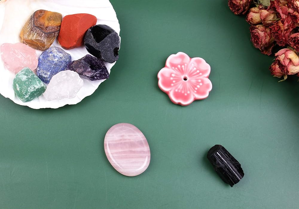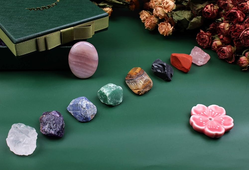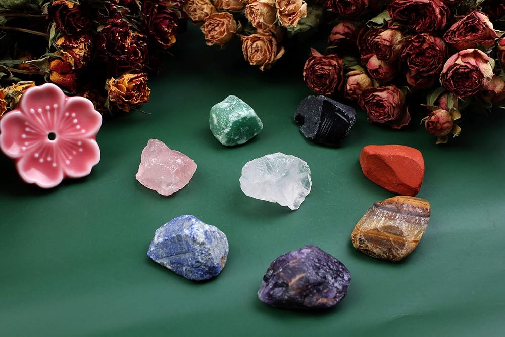 ♥8 NATURAL ROUGH CHAKRA STONES(total weight 0.35-0.4lb, diameter 1.2-1.9in) : Dongling jade, red jasper, tiger's eye stone, amethyst, obsidian, Pink crystal,lapis lazuli and transparent crystal.which with the function of powerful stone energy, enhance meditation, and the recovery of body and mind .