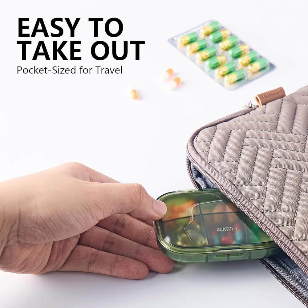 POCKET-SIZED FOR TRAVEL: Our daily pill organizer is portable to take out, can be easily put into the pocket, purse, or suitcase. Each pill box compartment can hold 8 Fish Oils, 10 Vitamins, or 10 Capsules. Dimension: 4.1 x 2.8 x 1.0 inches.