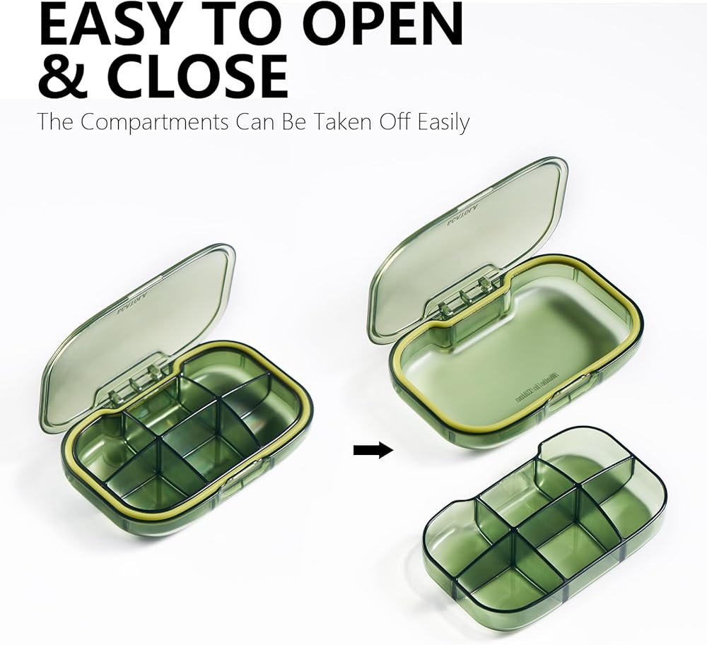 6 DETACHABLE COMPARTMENTS & LARGE CAPACITY: The travel pill box has 6 removable compartments that can be taken off easily so you can clean the pill case and refill medicines such as fish oil, vitamins and capsules. It also can be taken as jewelry or storage case.