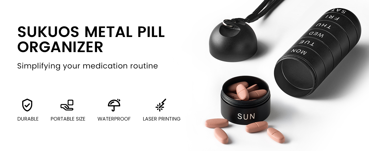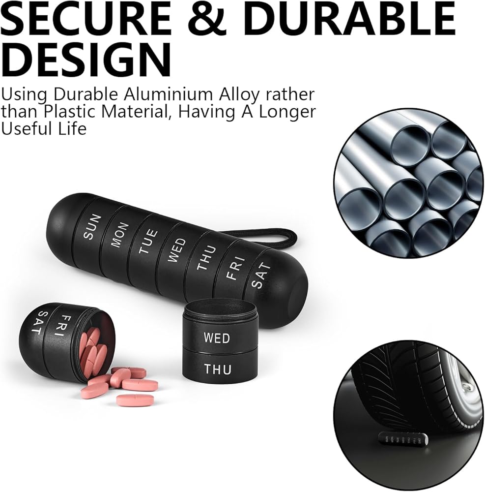 Sukuos Weekly Pill Organizer, Metal Portable Daily Pill Box Moisture Proof Stackable Aluminum Alloy BPA Free Travel Outdoor 7 Day Pill Case and Large Compartment to Hold Vitamins, Fish Oil