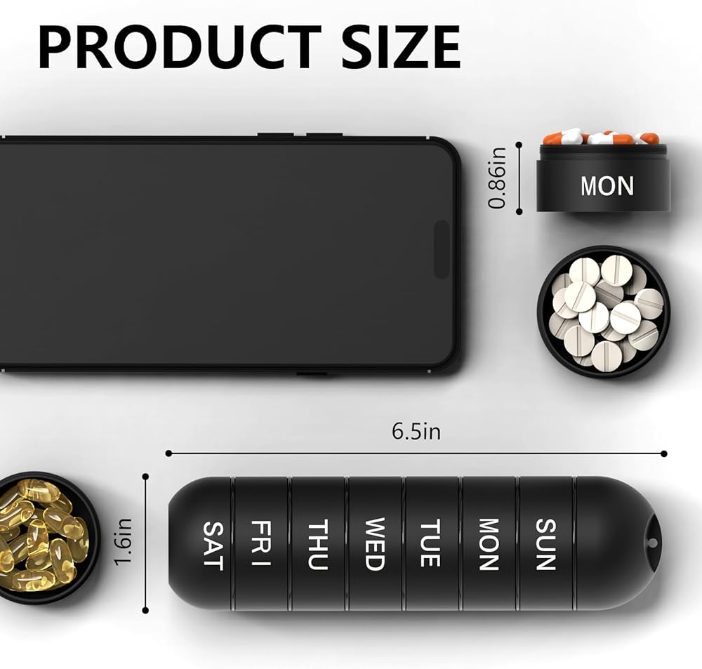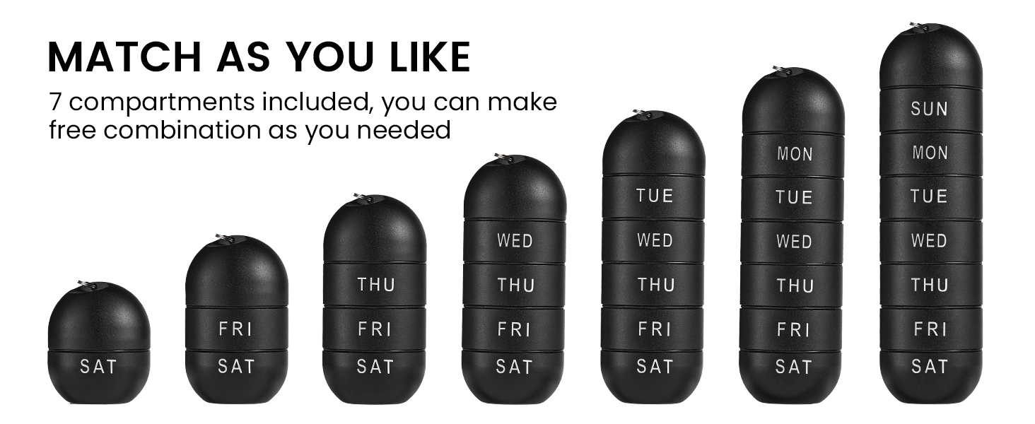 PORTABLE & LARGE CAPACITY:Our metal travel pill organizer is portable to take out for travel, it is lightweight and durable. 7 extra large compartments for weekly pills, each compartment can hold 8 Fish Oils, 16 Vitamins, or 19 Capsules. The metal pill box is stackable, so you can combine them according to your needs. It can be put in your pocket or backpack. Dimension: 1.6 x 1.6 x 6.5 inches.
