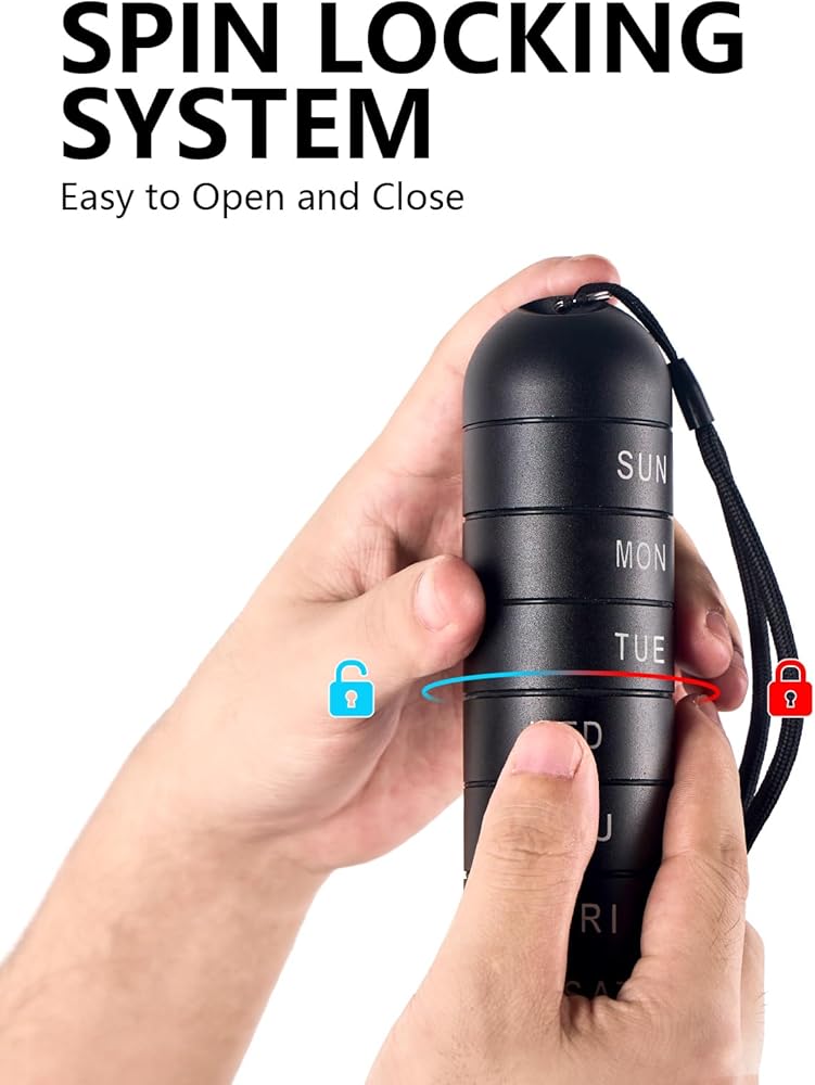 ADVANCED ALUMINUM ALLOY: Using BPA free and high quality medical metal material rather than cheap plastic, which is sturdier and healthier. The spin locking system keeps tightly closed, never worry about pills spill out.