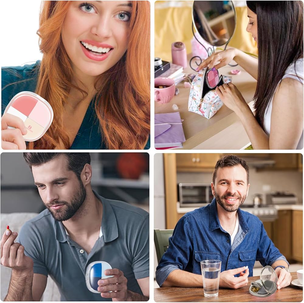 Small Pill Container with Portable Travel Size: The Pill Container measures 4.2 "x3.1 "x3" and fits easily in your coat pocket, small bag, backpack, and handbag. Taking up tiny space, and is easy to carry for travel. The size of a blush for girls or a deck of cards for men. It looks nothing like a pill box and keeps its own mystery.